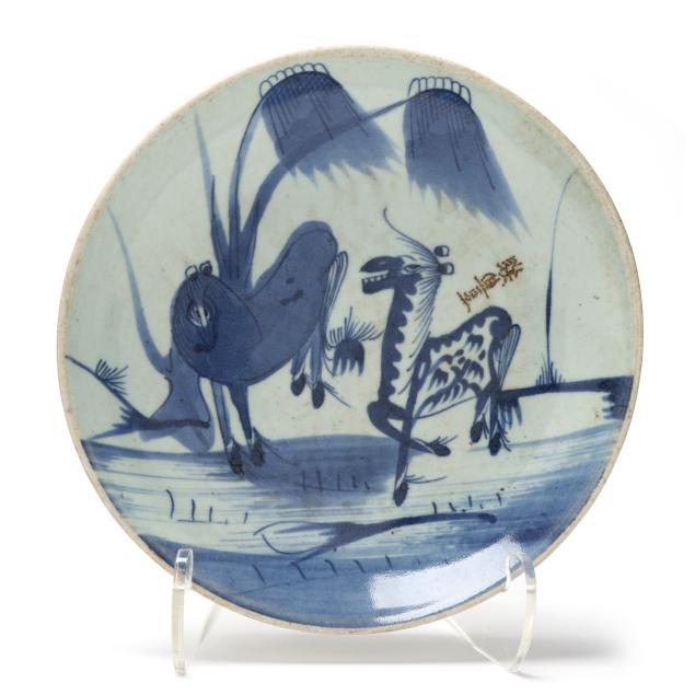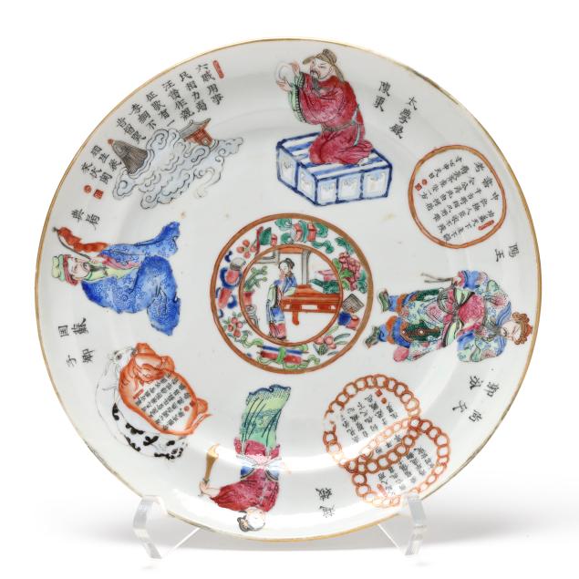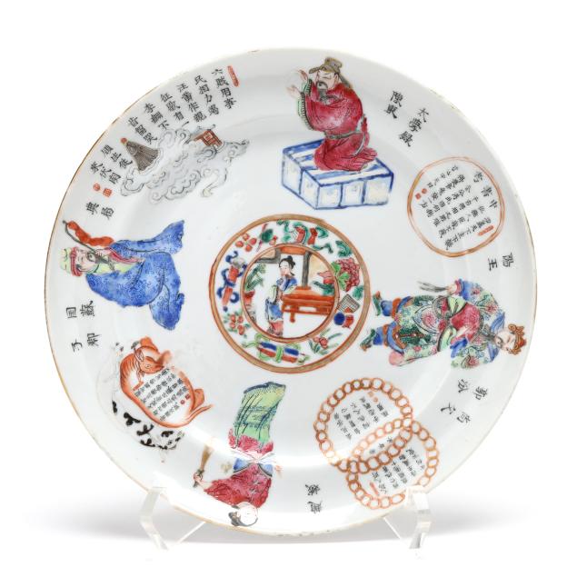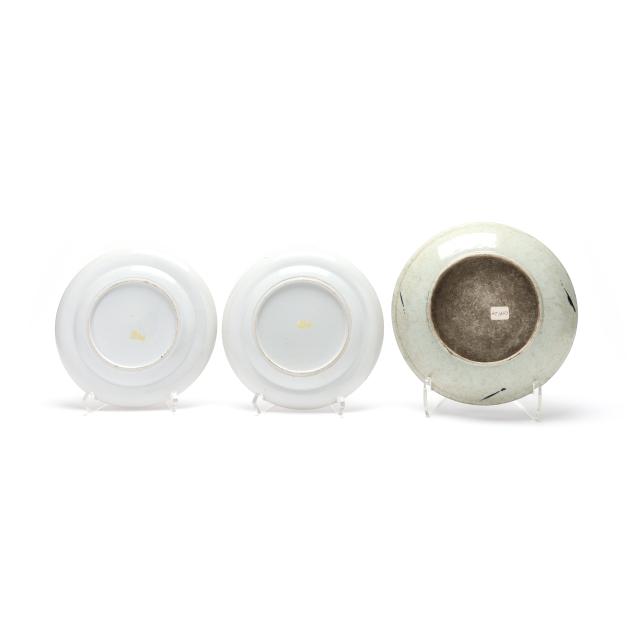 19th century, includes a pair of famille rose Wu Shuang Pu plates (8 in. diameter)(one dish with a few fleabites to rim), and a dish with blue horses painted in loose brushwork over a light celadon blue ground, three Chinese characters etched into well of dish (9 1/8 in. diameter)(kiln firing crack or repair to foot rim).