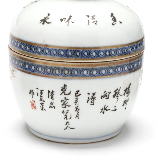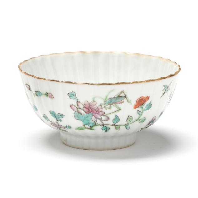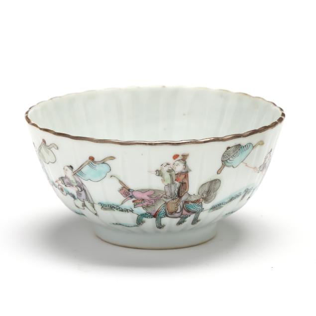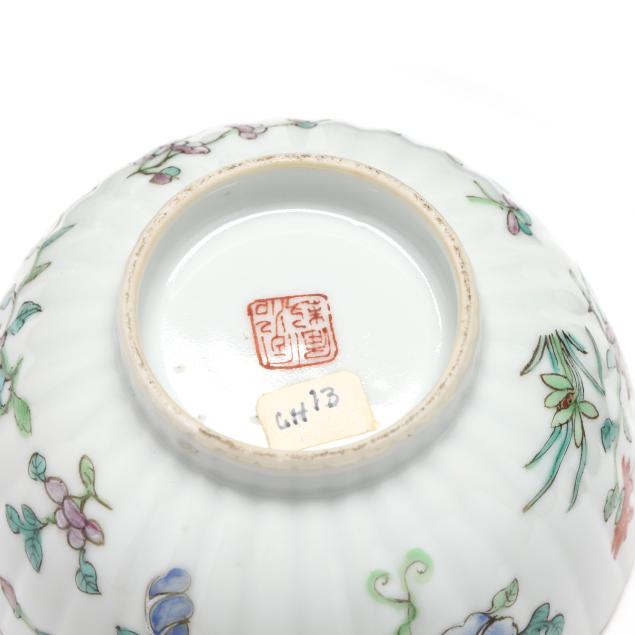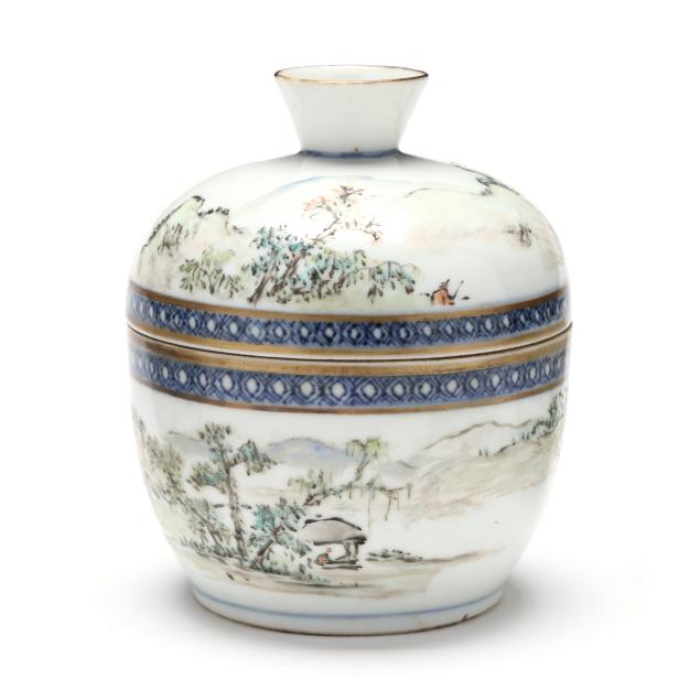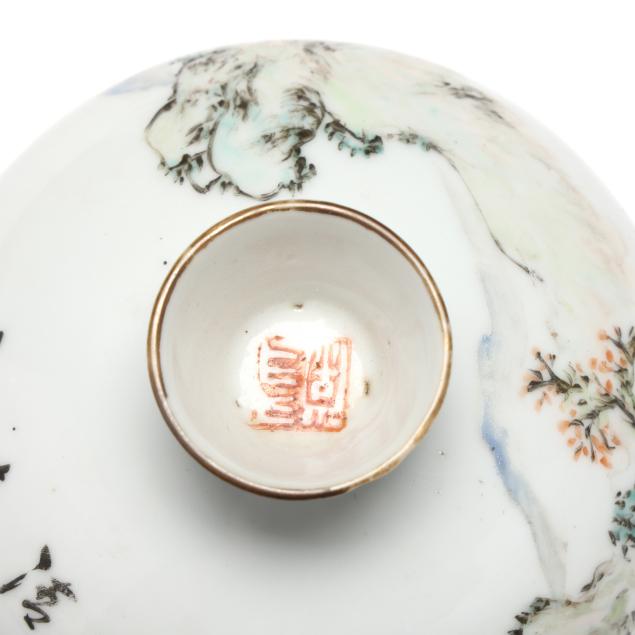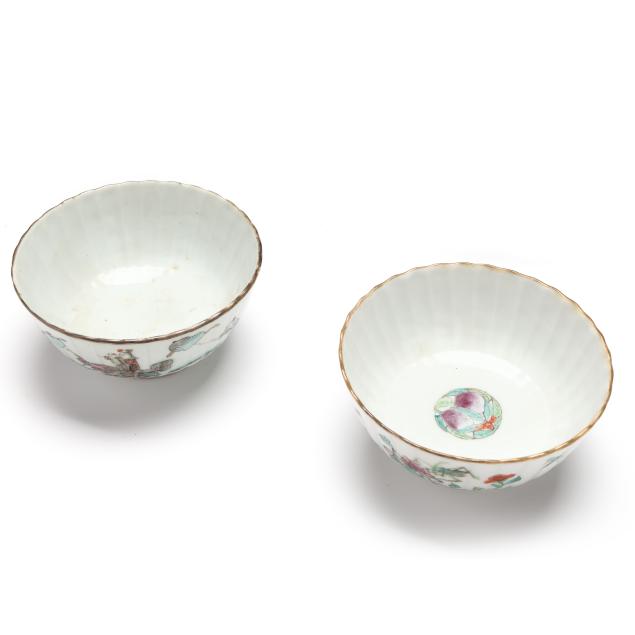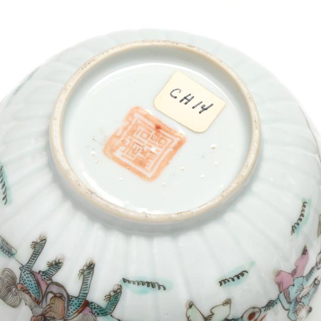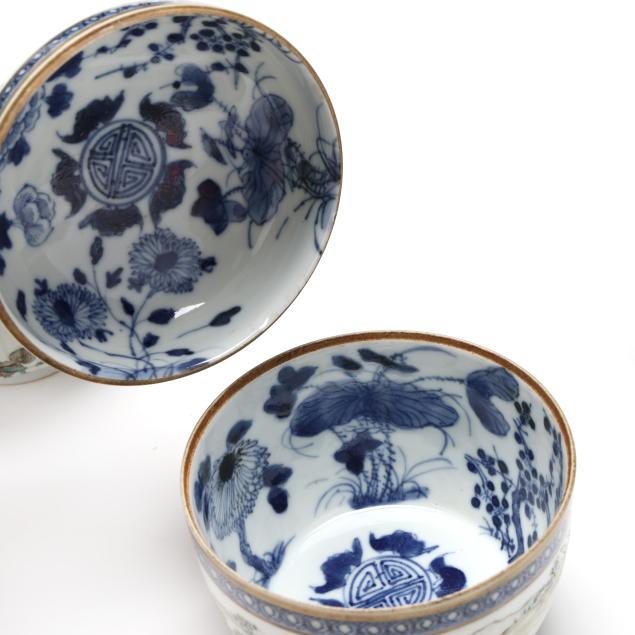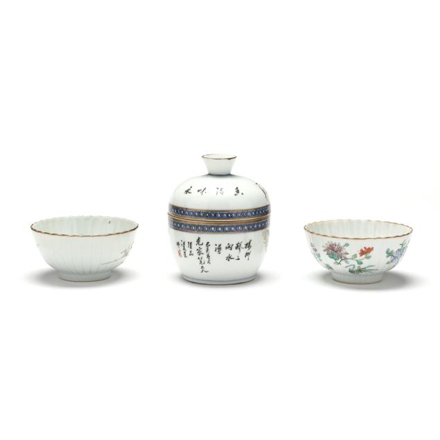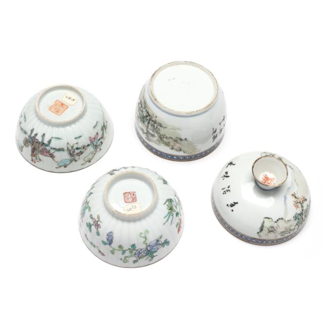 Early 20th century, includes a pair of scalloped rim and ribbed bowls with gilt rims, one with flowers and one with figures in a procession, both marked to underside (2 1/8 in., 4 1/4 in. diameter)(some fritting to the rim of bowl with figures), bowl with cover, cover is a cup on stand, hand painted with scenic village landscape, with inscription to both cover and bowl, interior of bowl and cup hand painted in blue with flora, bats, and longevity symbols, red mark to interior of cover's foot(5 1/8 in., 4 1/8 in. diameter)(a slight nick to rim of cover).