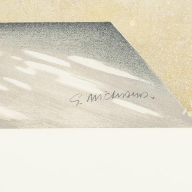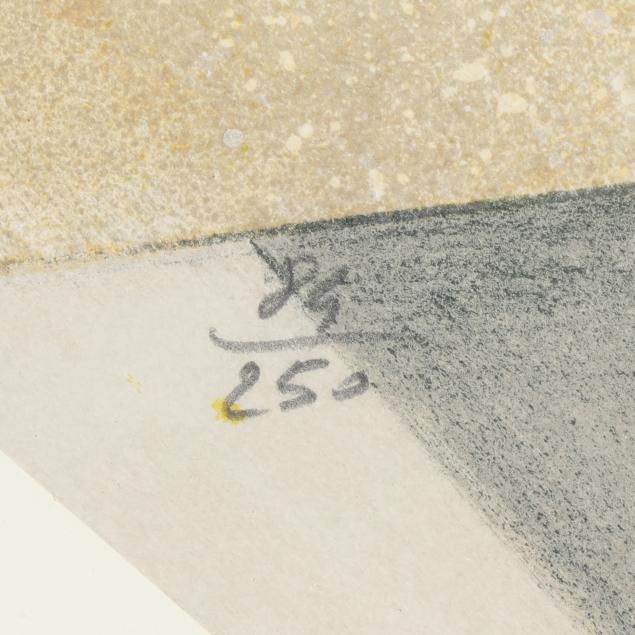 Embossed lithograph in colors, pencil signed to lower edge, numbered 89/250, retaining gallery label to verso, mounted and framed below glass.