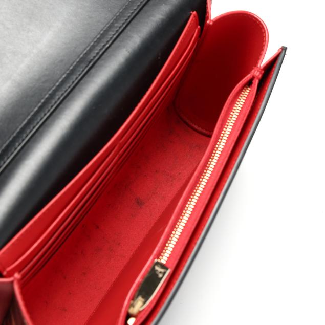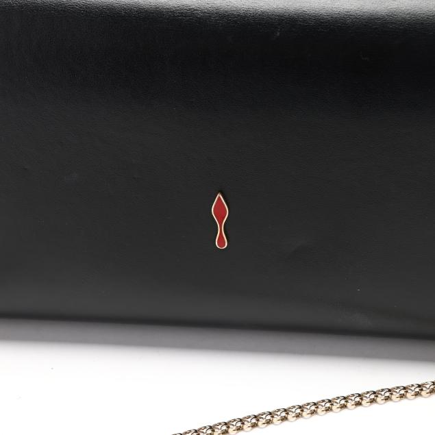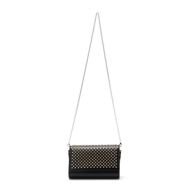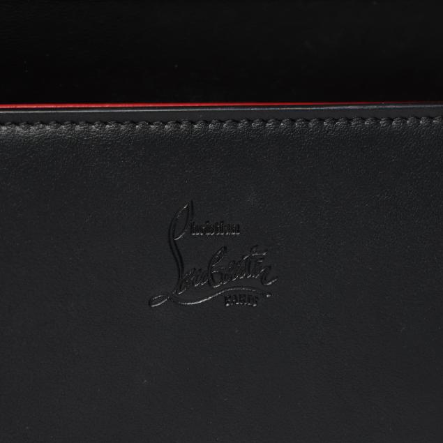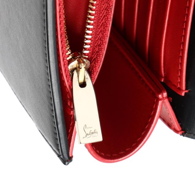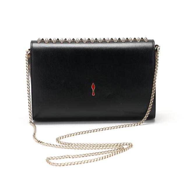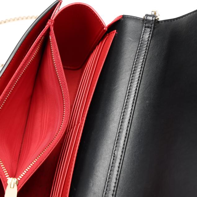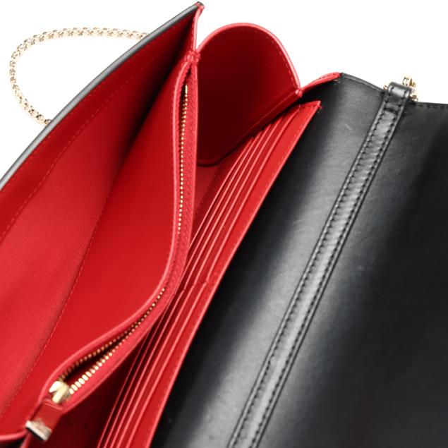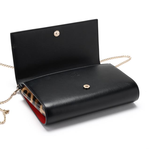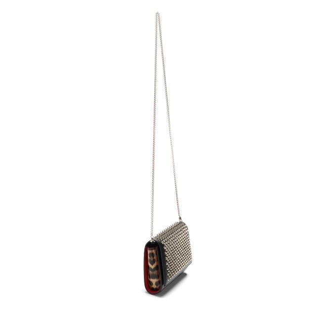 The exterior in black leather, with detachable gold-tone chain strap, red bottom logo to back, gold-tone spike studs to flap, red and cheetah print accents to ends, magnetic clasp, and debossed signature, the interior in red leather with two main pockets, a zipper pocket, and card slots, stamped made in Italy.