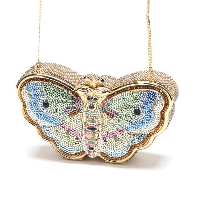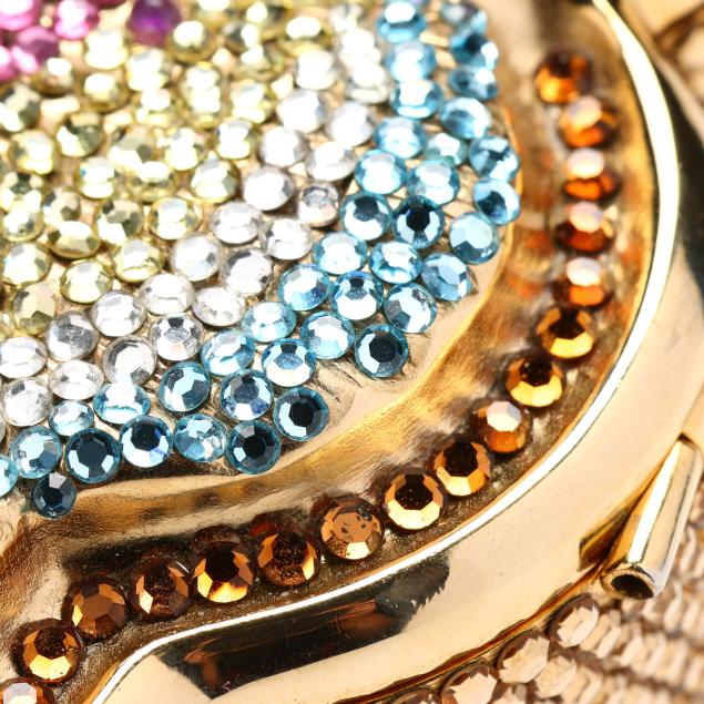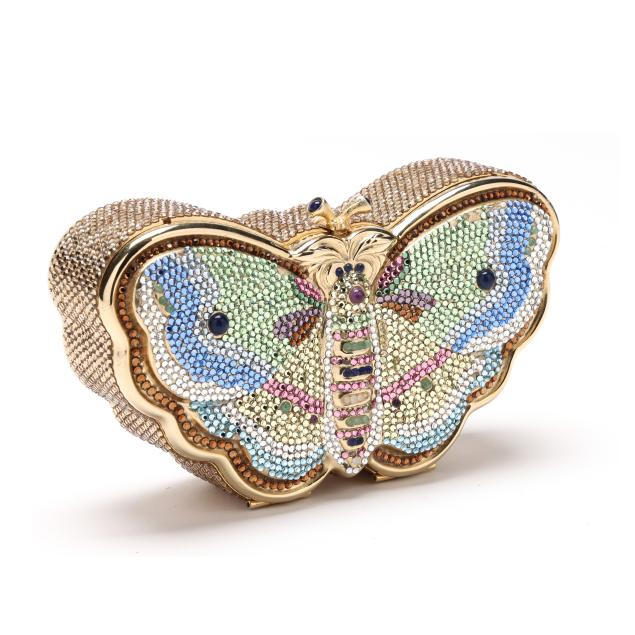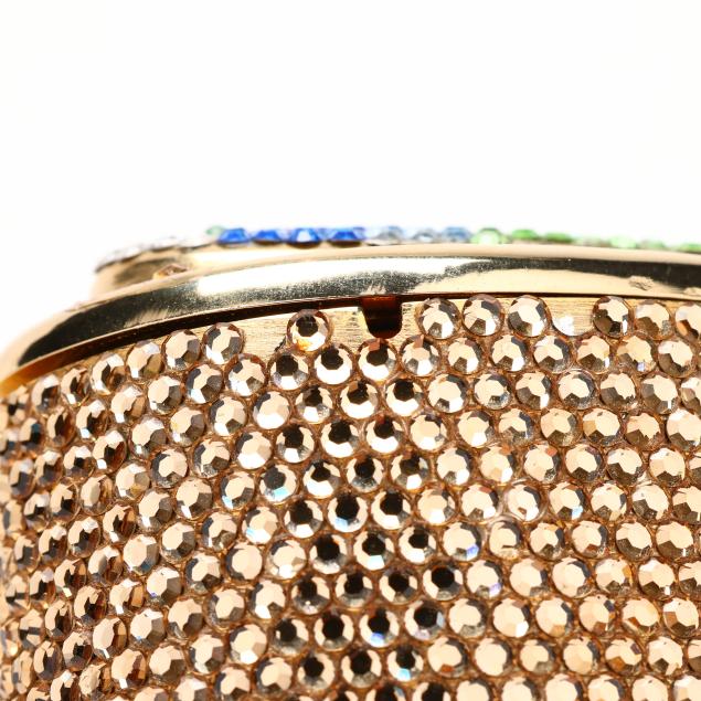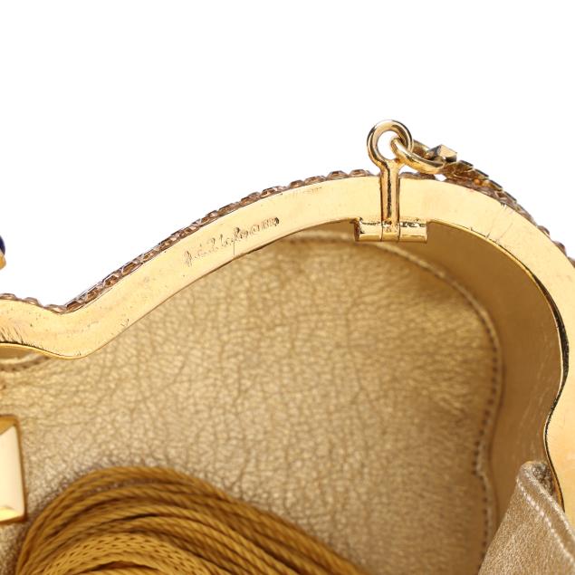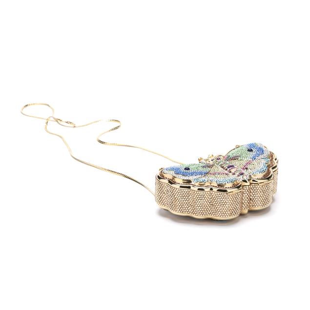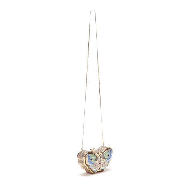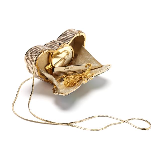 Gold-tone minaudière in the form of a butterfly, set throughout with multi-colored crystals, with fold away gold-tone shoulder chain and gold-tone hardware signed and dated, the interior in metallic gold leather with name plate, accompanied by mirror and comb.