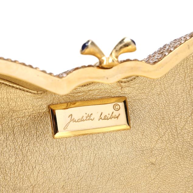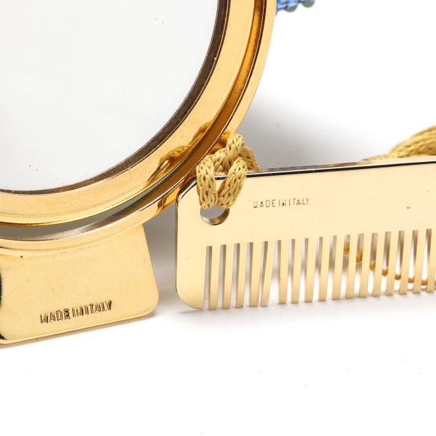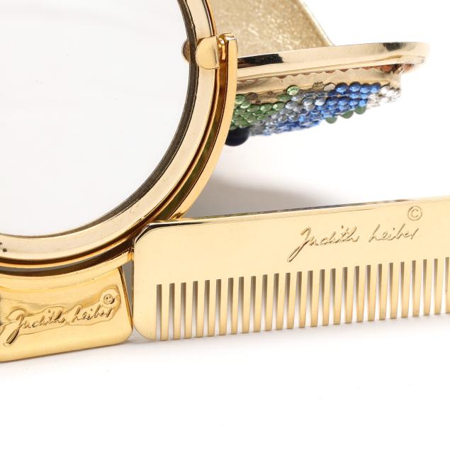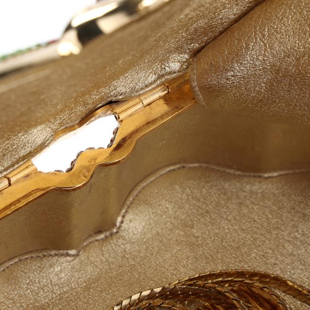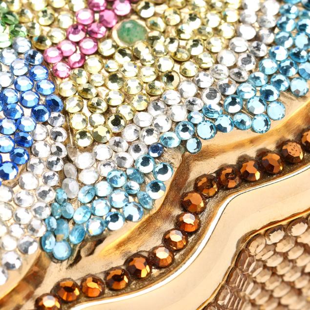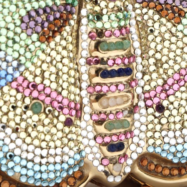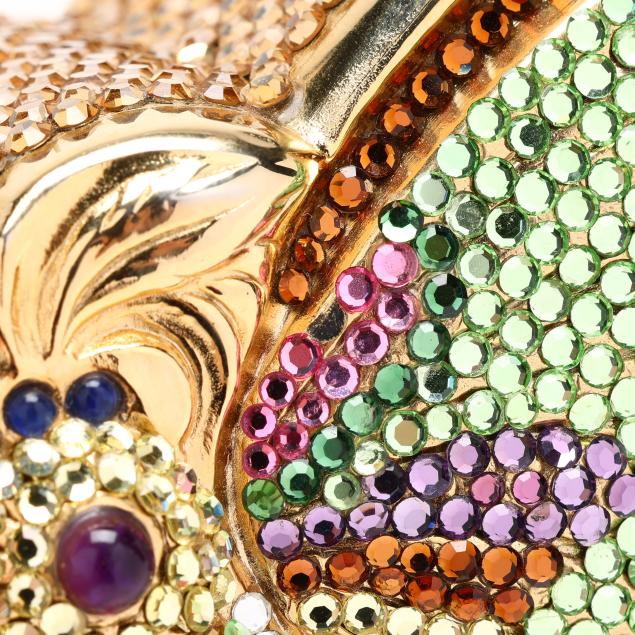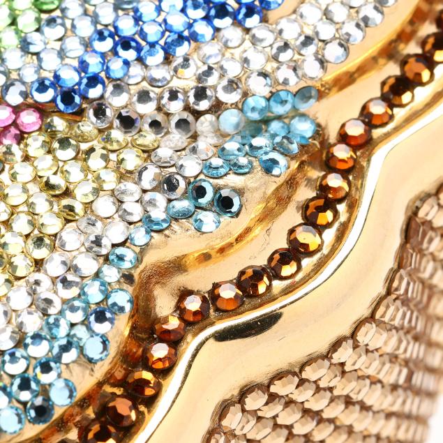 Gold-tone minaudière in the form of a butterfly, set throughout with multi-colored crystals, with fold away gold-tone shoulder chain and gold-tone hardware signed and dated, the interior in metallic gold leather with name plate, accompanied by mirror and comb.