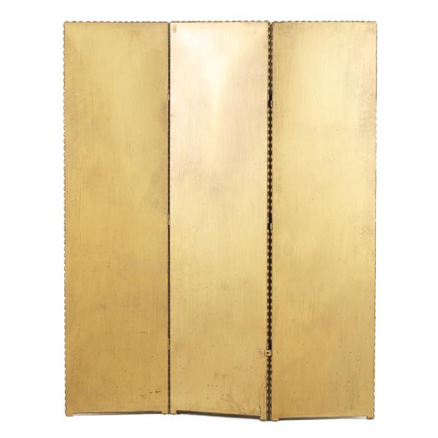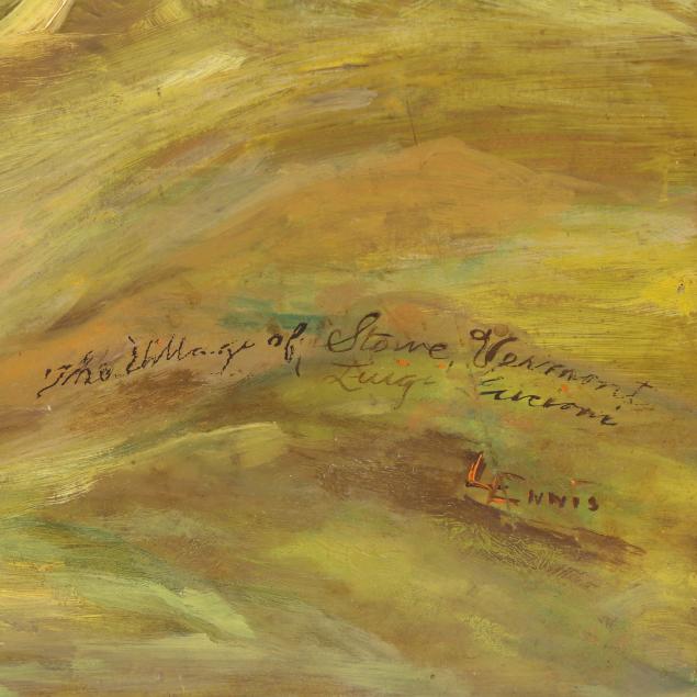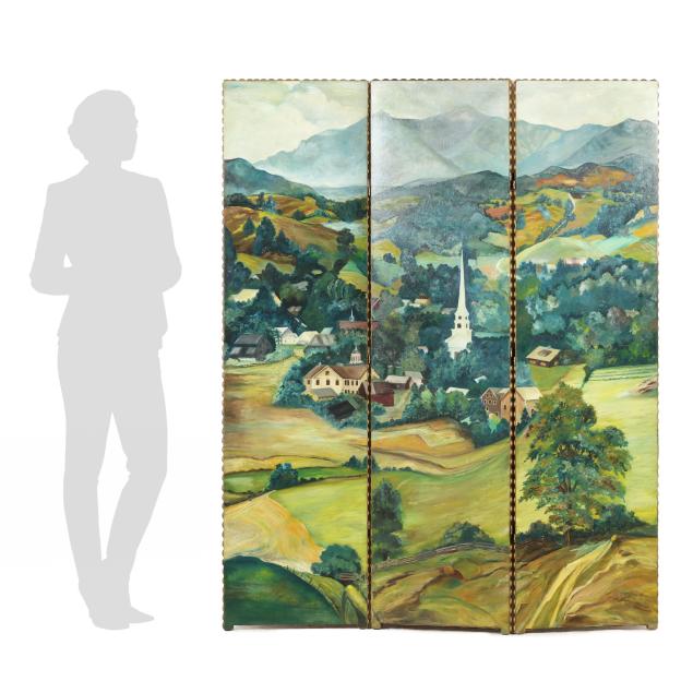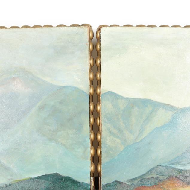 Mid-late 20th century, American, depicting a mountain landscape with architecture, each panel with sides studded and wrapped in canvas, gilt painted verso.