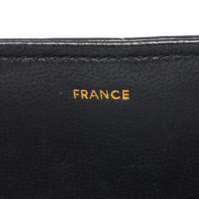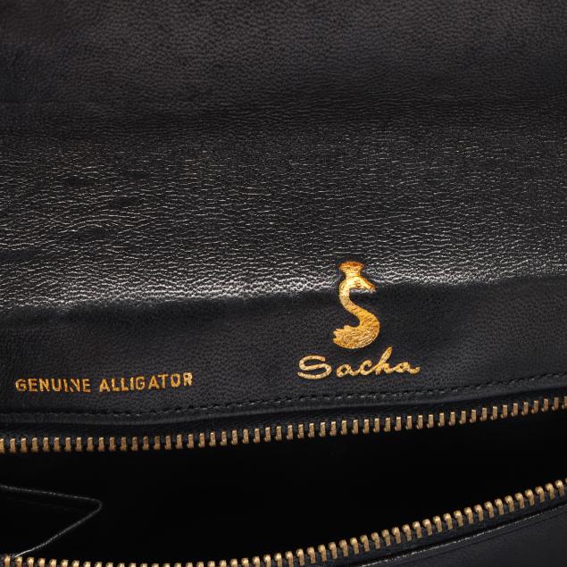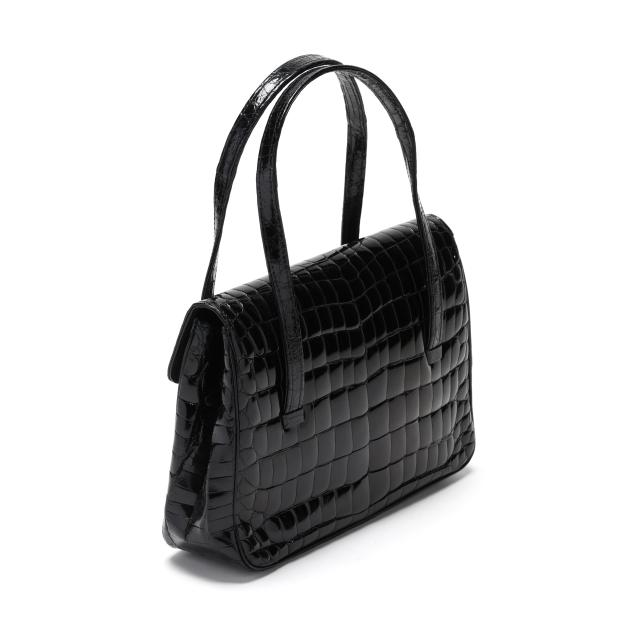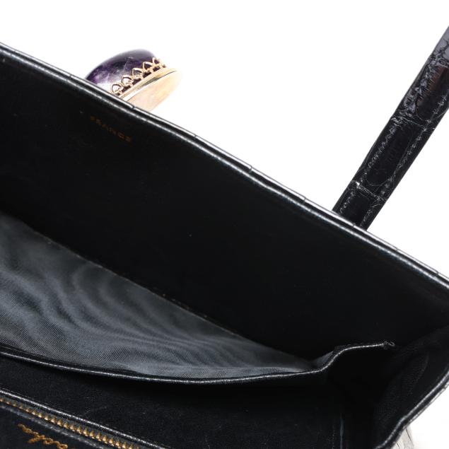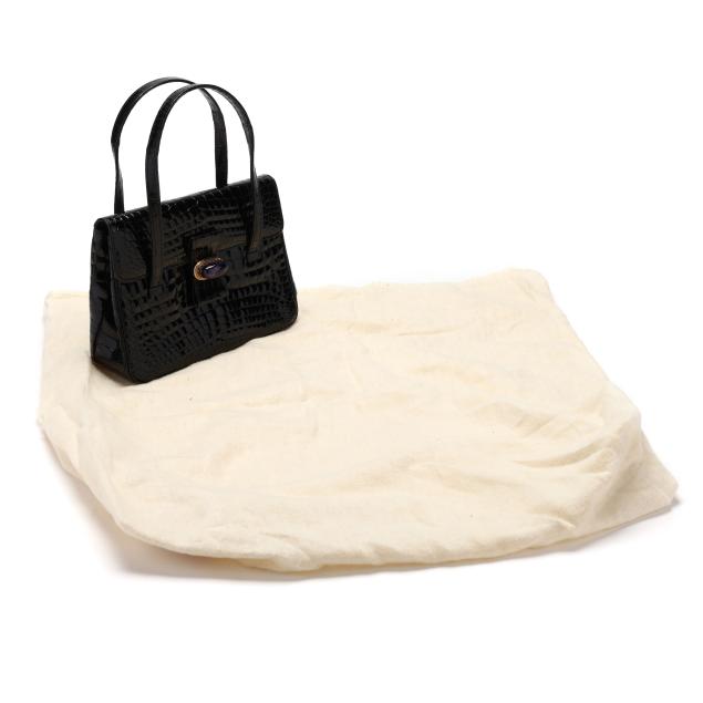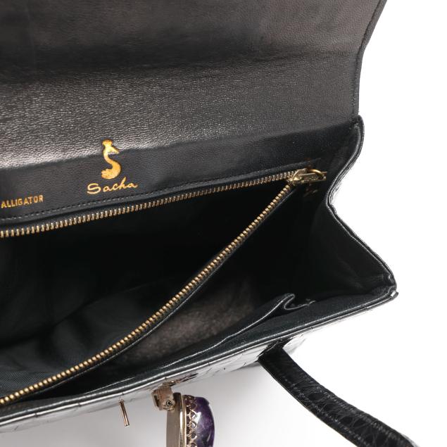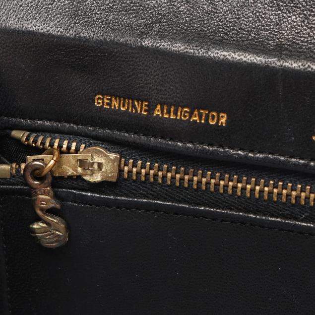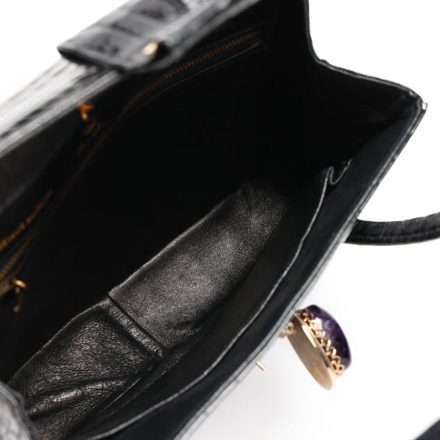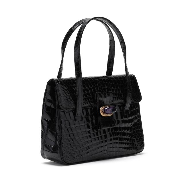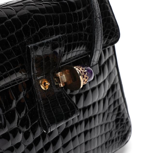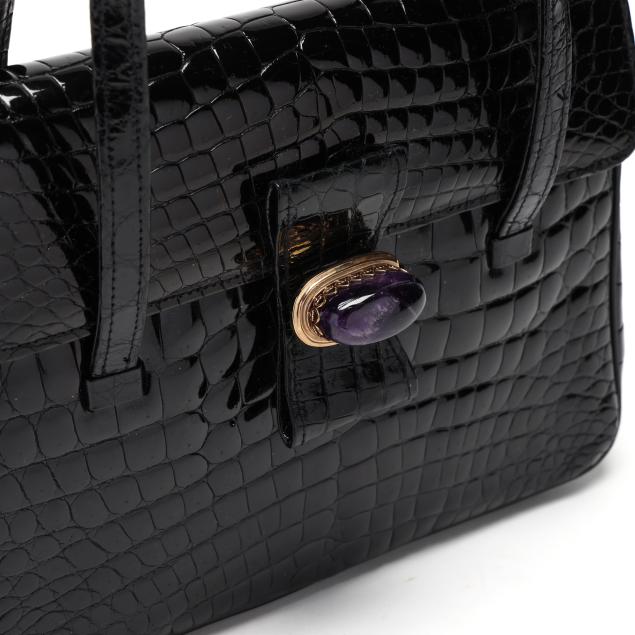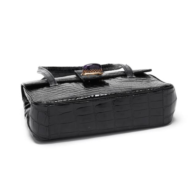 The exterior in black alligator patent leather, with flat leather handles, gold-tone hardware, and flap with bow motif and tumbled amethyst set clasp, the interior in black leather with main pocket, side open pocket, and side zipper pocket with gold-tone swan zipper pull, signed and stamped Genuine Alligator.