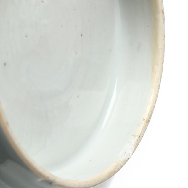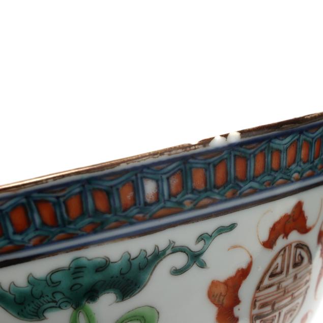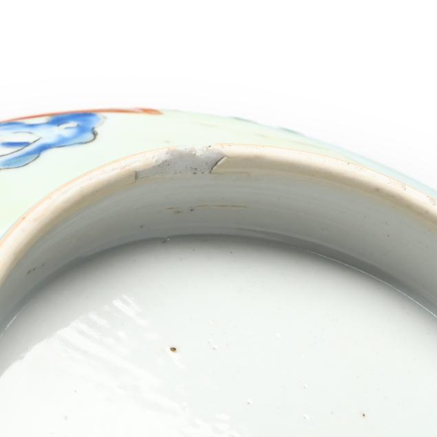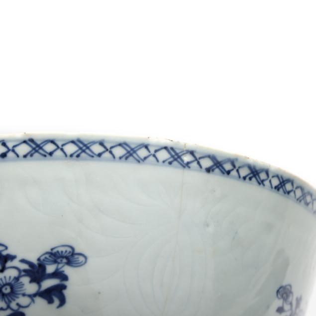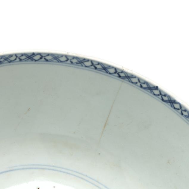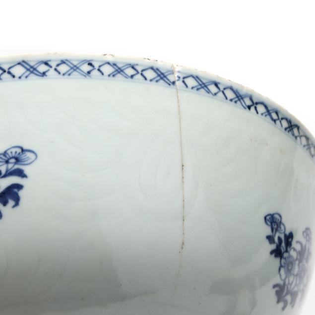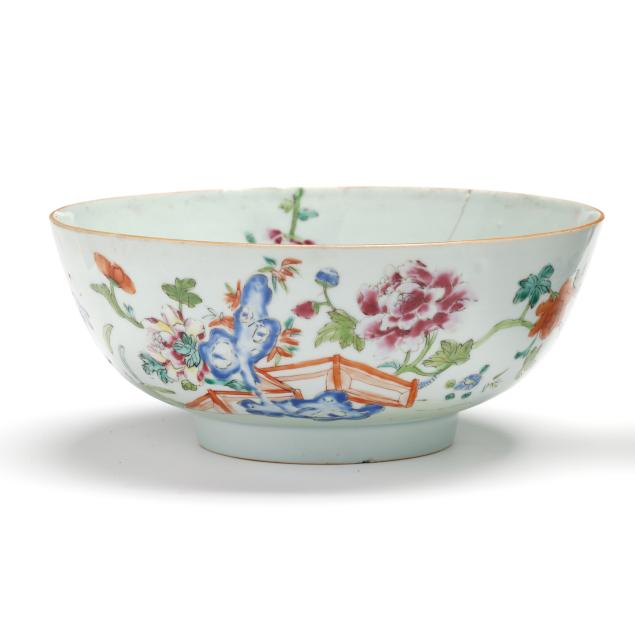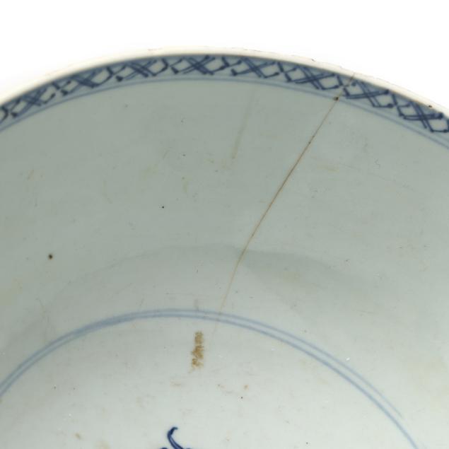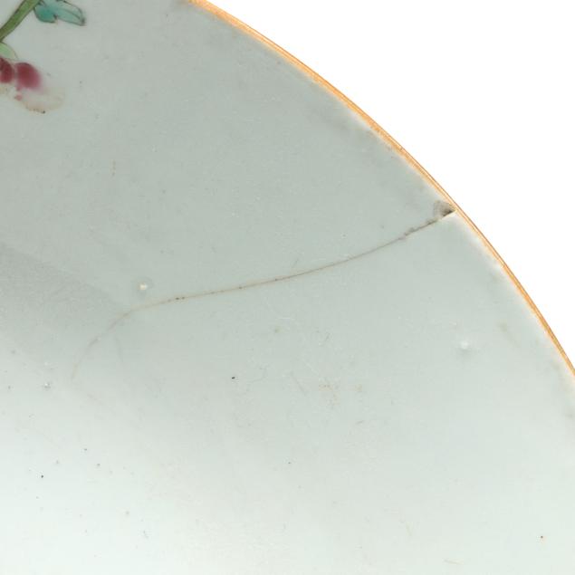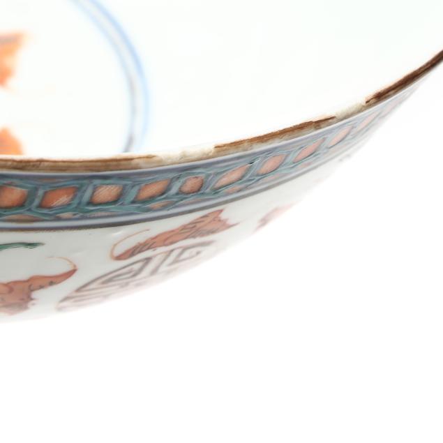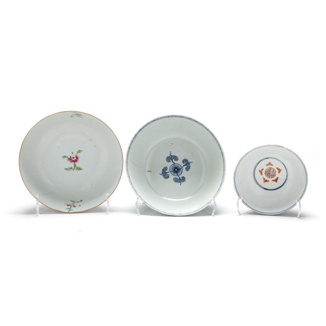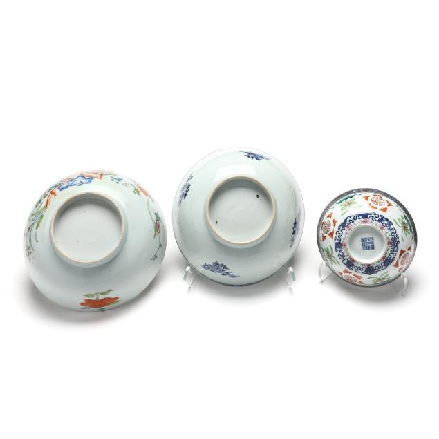 Center bowl with multicolor floral decoration with a nick and small chip to foot rim, hairline wrapping rim with associated fleabite at rim, small firing crack to rim; center bowl with cobalt decoration with several nicks to rim, two toned hairlines wrapping rim; medium size table bowl with a few nicks to rim.
