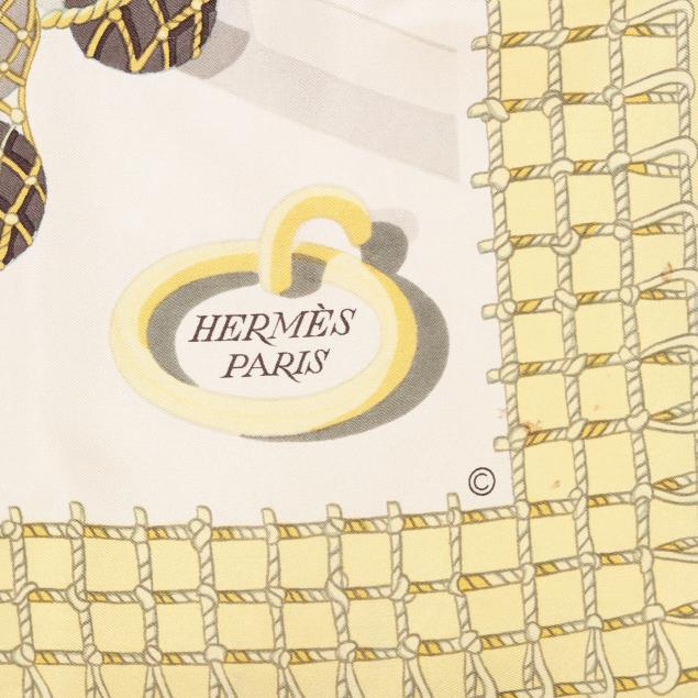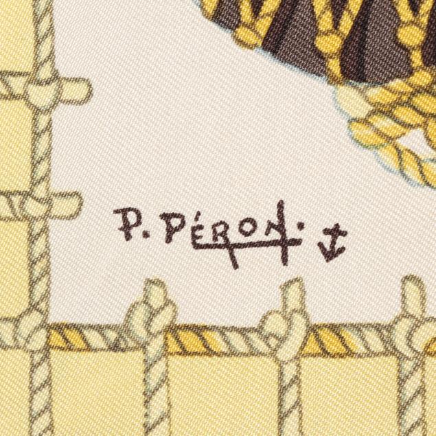Designed by artist Pierre Péron, the silk twill with rolled and hand stitched edges, with a color palette of black, yellow, and white.