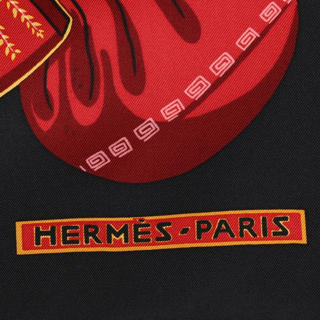 Designed by artist Annie Faivre, the silk twill with rolled and hand stitched edges, with a color palette of black, red, and gold.