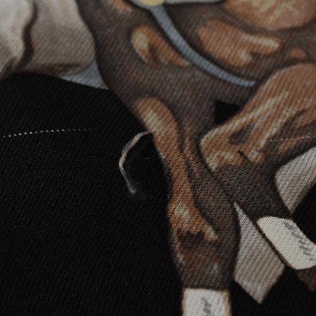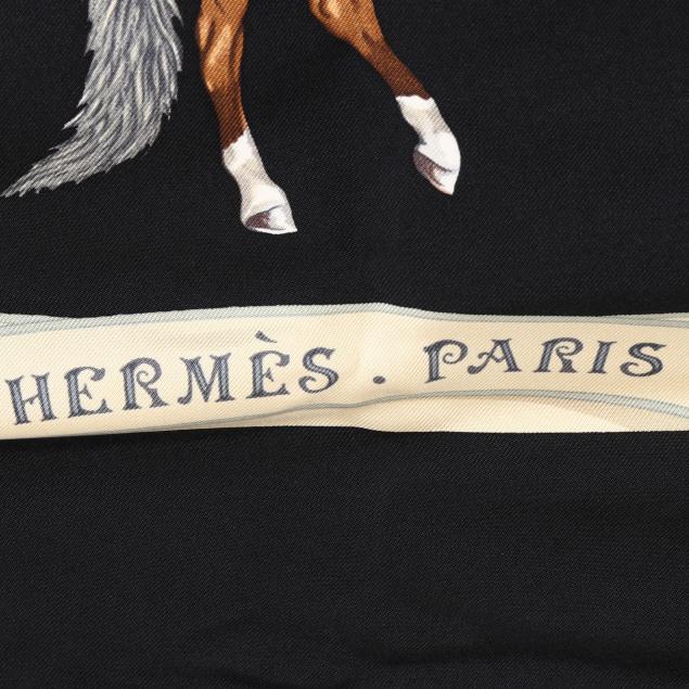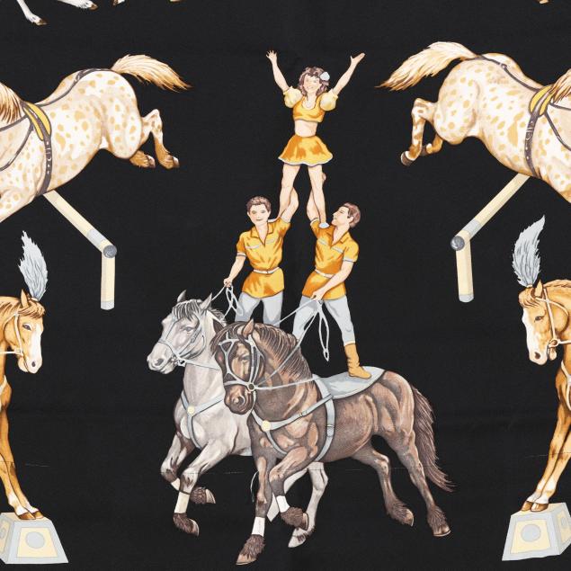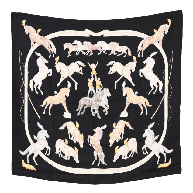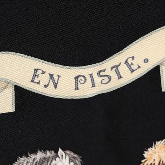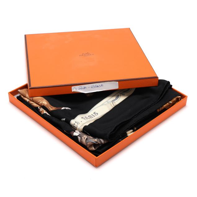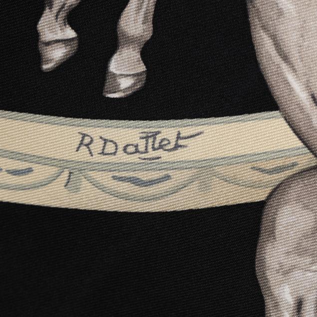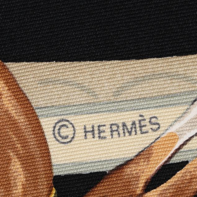 Designed by artist Robert Dallet, the silk twill with rolled and hand stitched edges, with a color palette of black, tan, and gold.