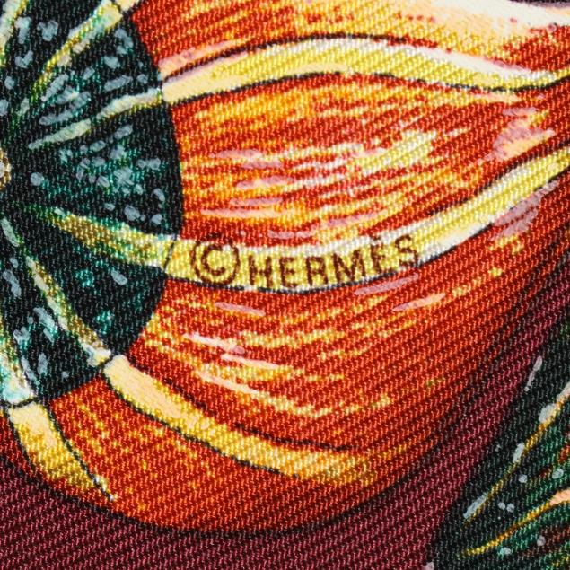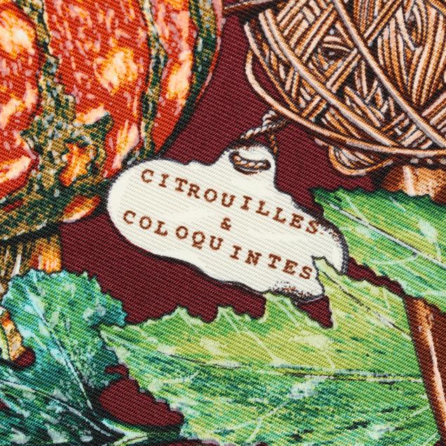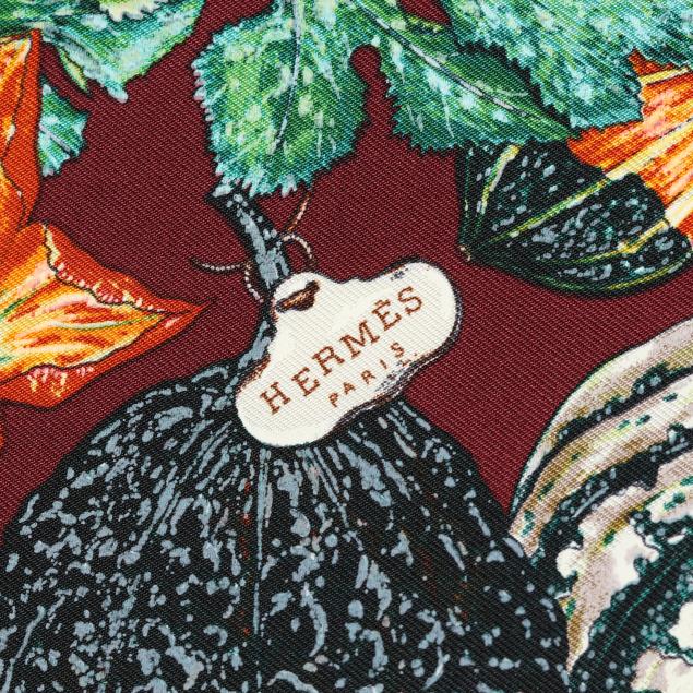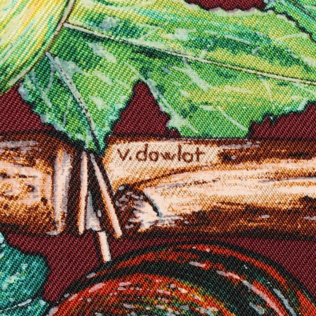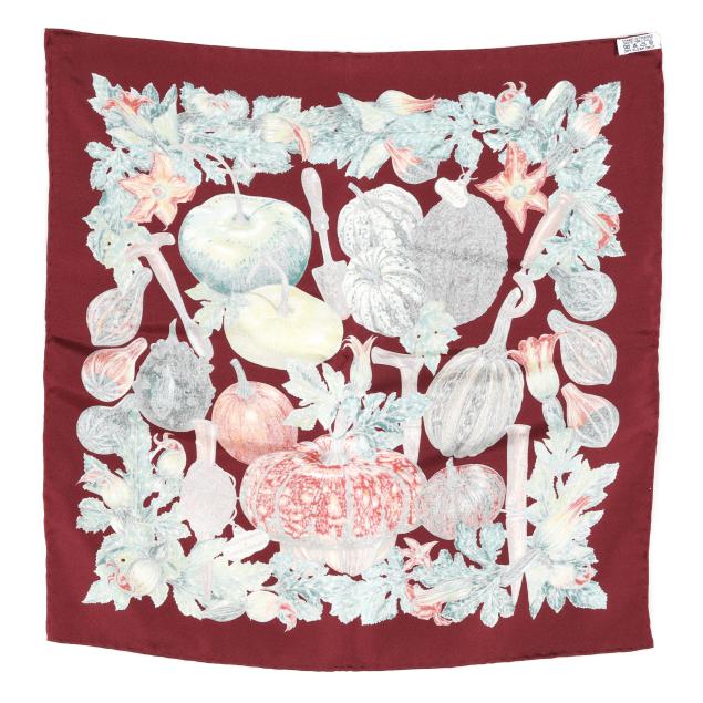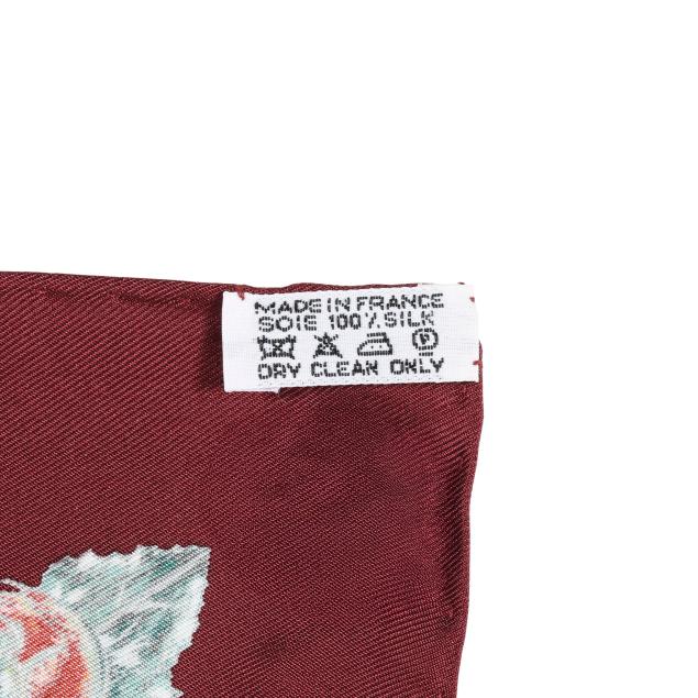 Designed by artist Valérie Dawlat Dumoulin, the silk twill with rolled and hand stitched edges, with a color palette of maroon, green, and orange, and with care tag.