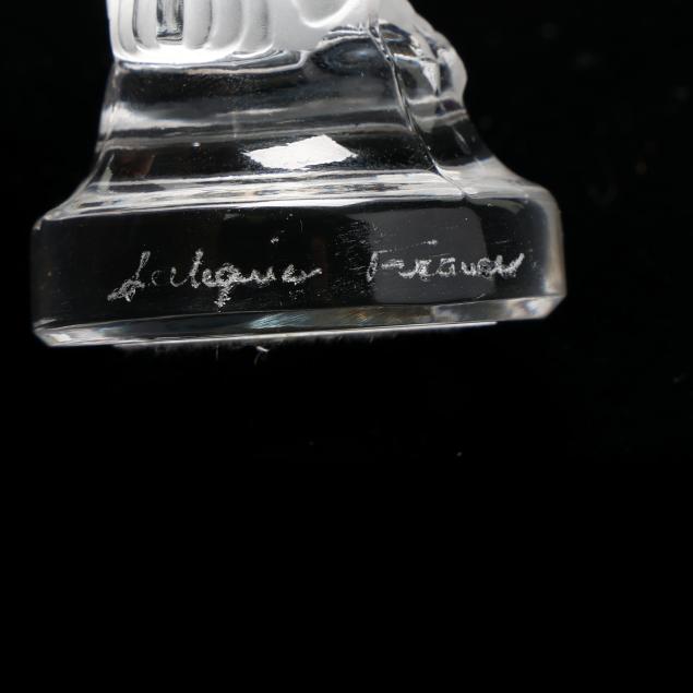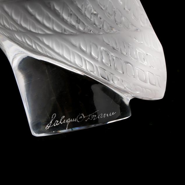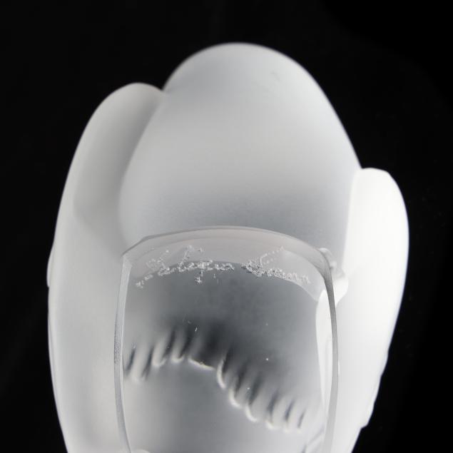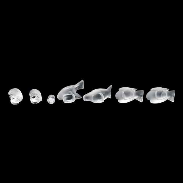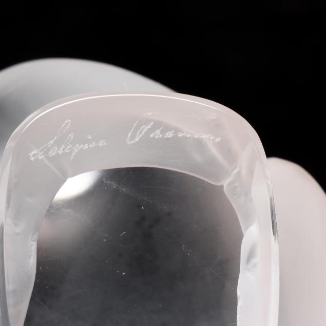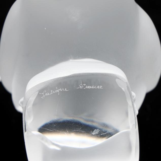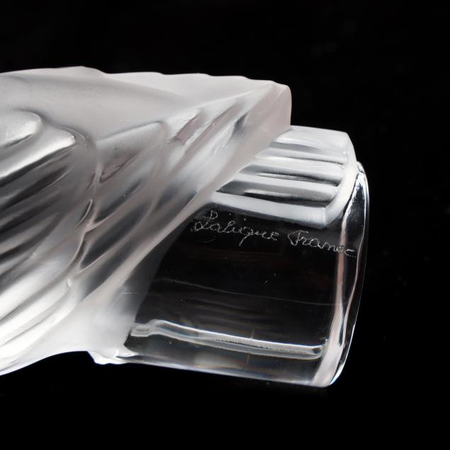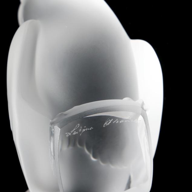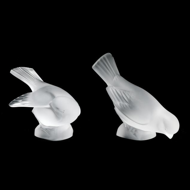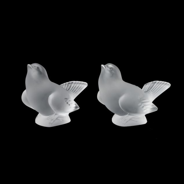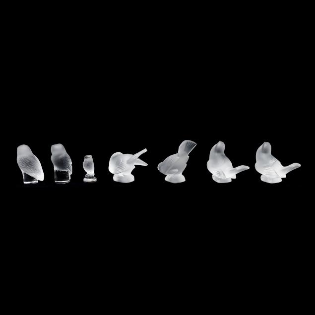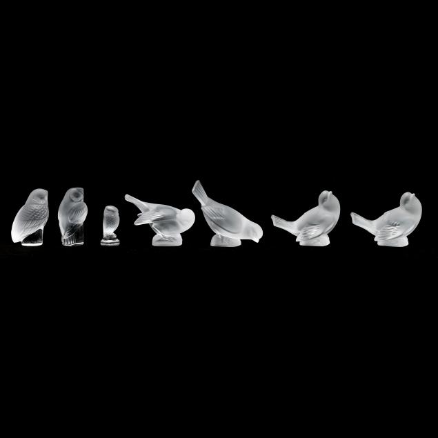 France, late 20th century, clear molded crystal in frosted and polished surface, including (2) sparrows with heads up; (1) sparrow with head down; (1) sparrow with head under wing; and (3) owl paperweights, each signed.