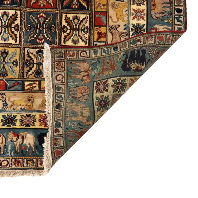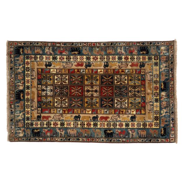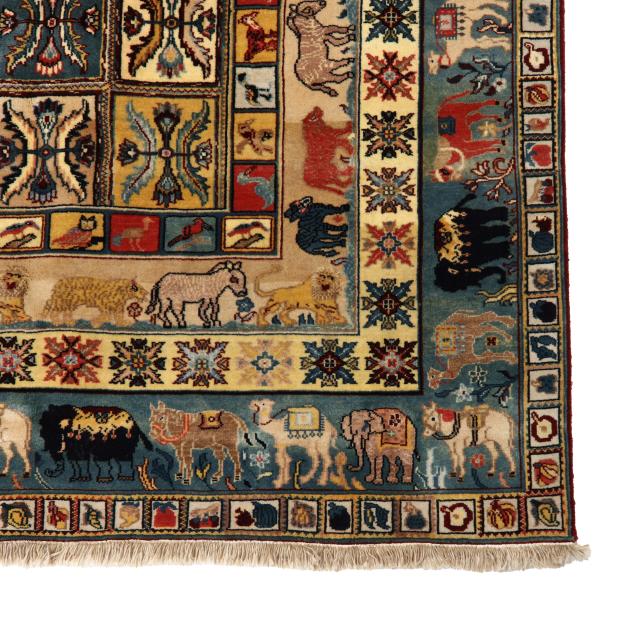 Wool on cotton foundation, the center field with grid of rectangles each containing a stylized floral cluster, surrounded by rectangles containing avian motifs, surrounded by borders of animals and fruit motifs.