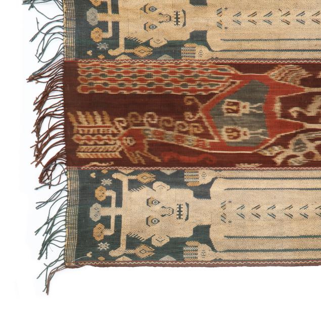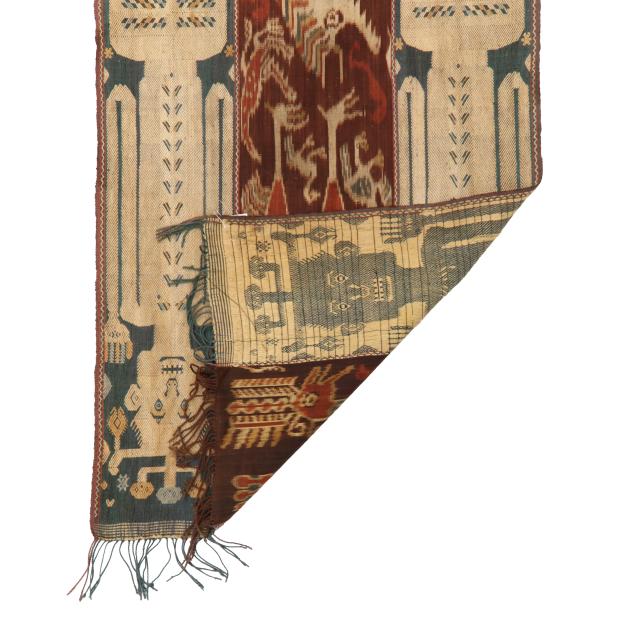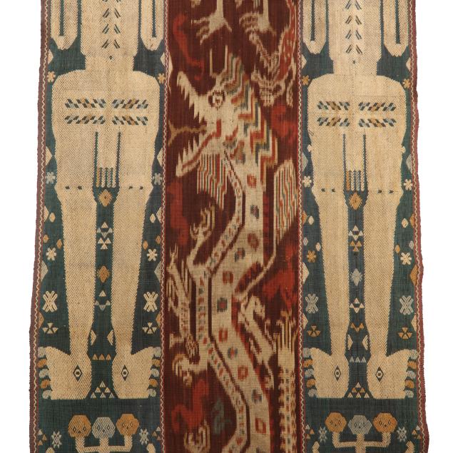 Cotton, the center with dragon and other figural motifs woven in brown, red, blue, and tan, each side panel woven with figural motifs in eccentric weft technique, twisted fringe to top and bottom.