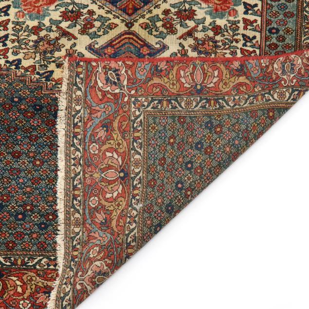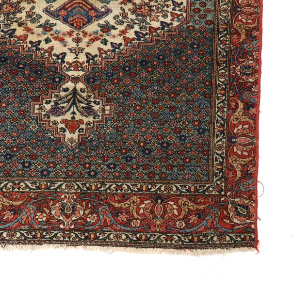 Wool on cotton foundation, the central blue poled medallion on a cream field with floral motifs, the light blue and green spandrels covered with small repeating florette motifs, the main red border with repeating palmette motifs, with multiple minor borders.