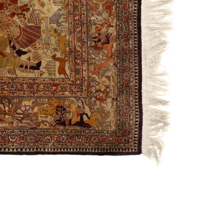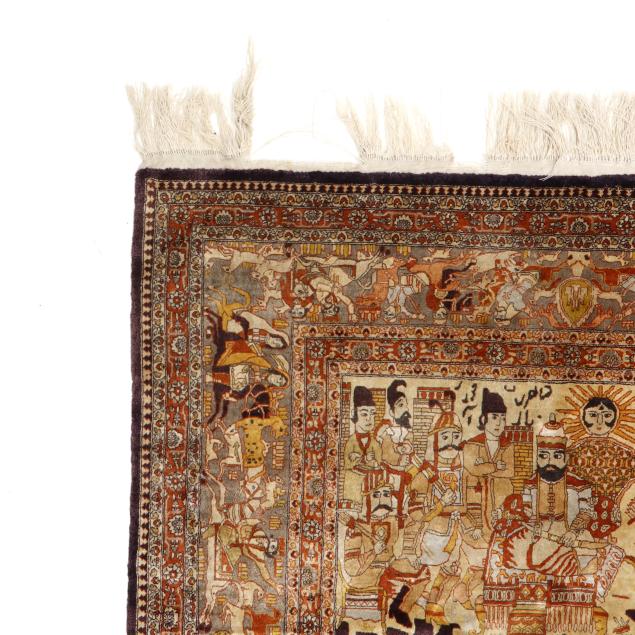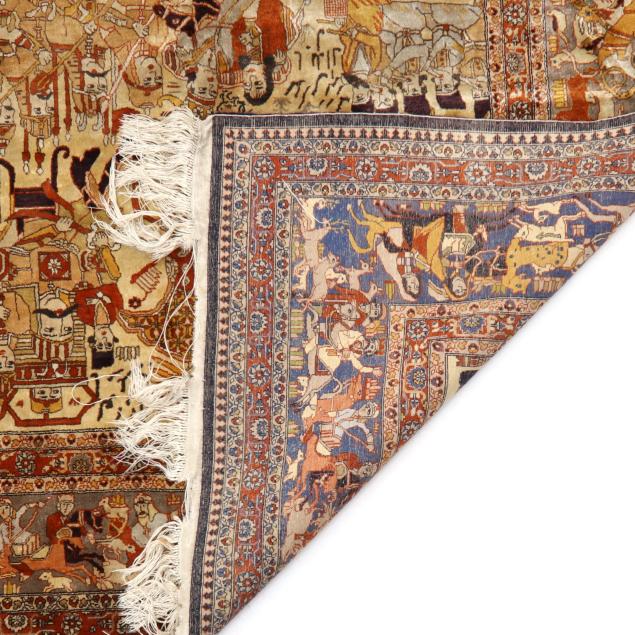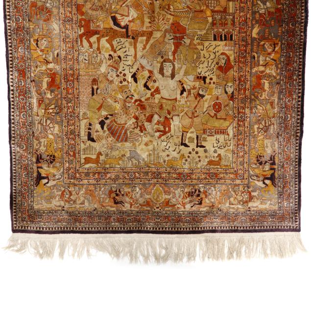 Private Collection, Edenton, North Carolina Persian legend is filled with battles and heroic warriors. So much so that it is unclear whether this carpet depicts scenes from the stories of the hero Rostam, or the stories of Amir Arsalan (who fought against a horned beast man), or the tales of Dirar ibn al-Azwar (known as "the bare-chested warrior.") The figure in the upper center is likely Mithra, the ancient Persian god of light. An almost identical rug exists in the Carpet Museum of Iran in Tehran.