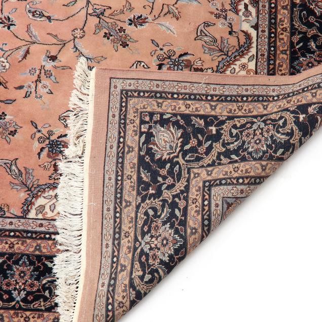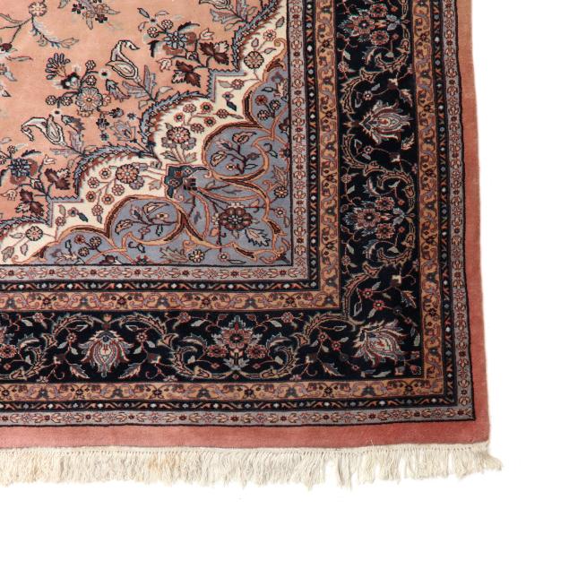 Wool on cotton foundation; the small central blue medallion with floral motifs and center cream and navy floral lobed motif, the pink field with scrolling floral vines, the spandrels in lavender and cream with floral motifs, the main navy blue border with repeating palmette and floral motifs, within multiple minor borders.