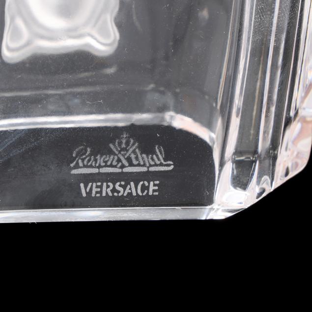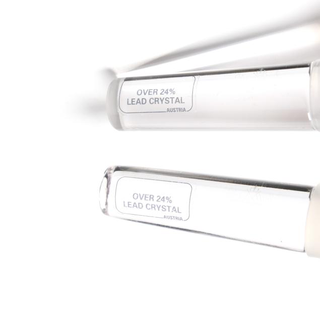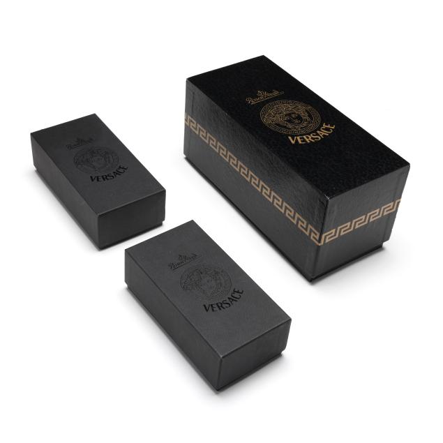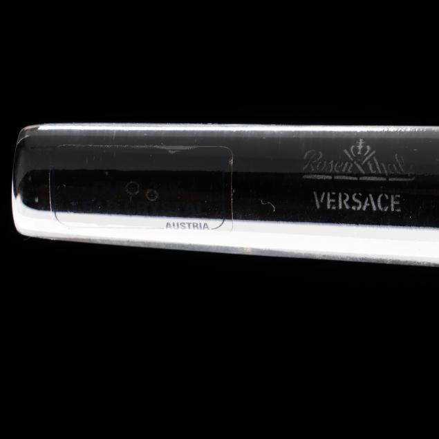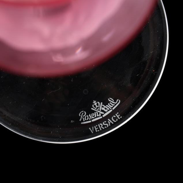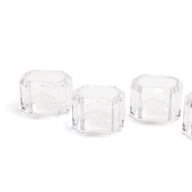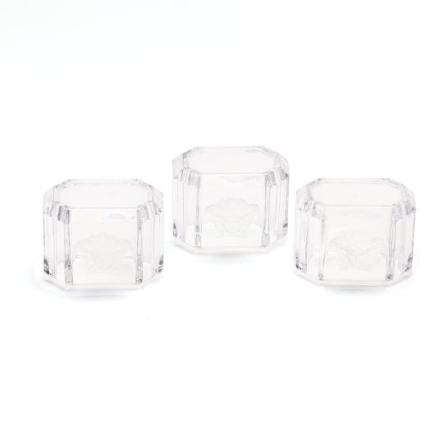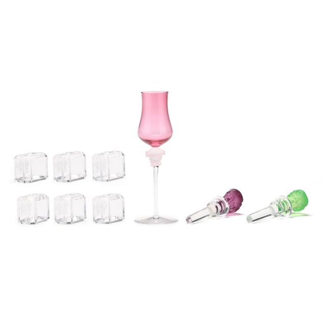 1996-2017 discontinued pattern, to include (6) napkin rings (2 1/2 in.); (2) wine bottle stoppers presented in original boxes (5 3/8 in.); and a Grappa wine glass presented in original boxes (8 1/2 in.), all marked.