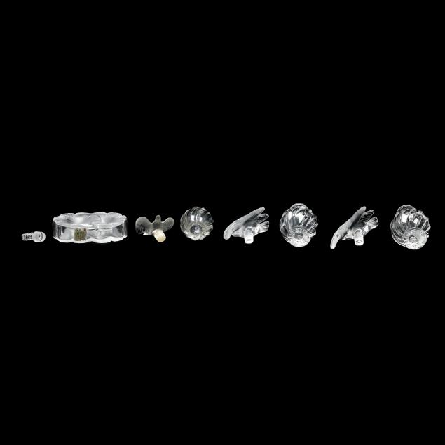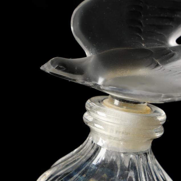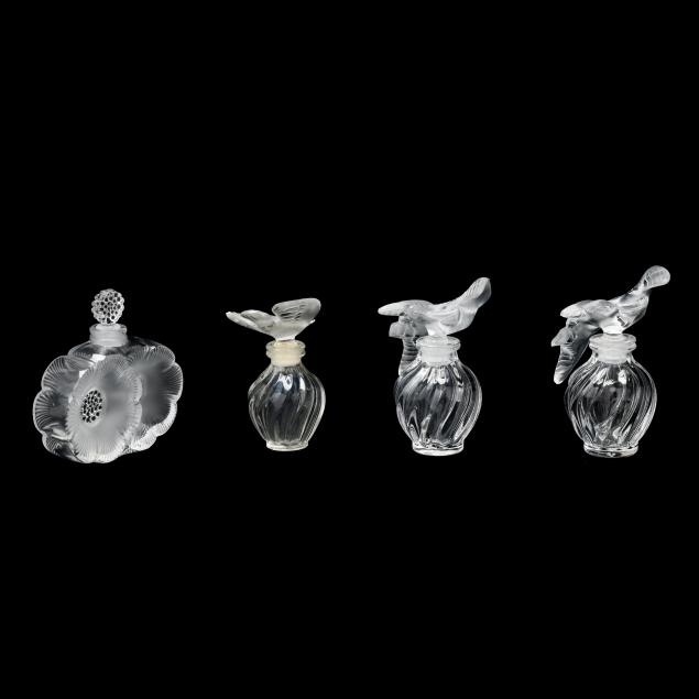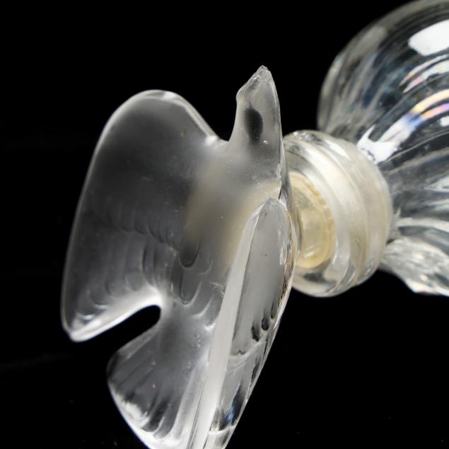 From the Estate of the late Lynette G. Totten, Butner, North Carolina Two flowers bottle with chip to rim; fleabite to wing of dove on one double dove bottle stopper, fleabite and a few small chips to stopper of the other; a few fleabites to single dove bottle stopper, perfume residue to base of stopper; miniature perfume appears unused, soap still in original plastic wrap.