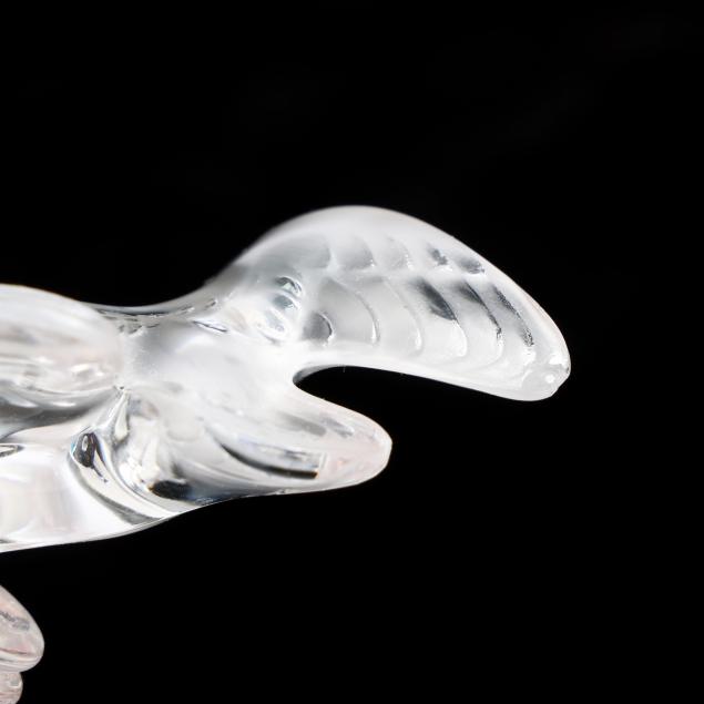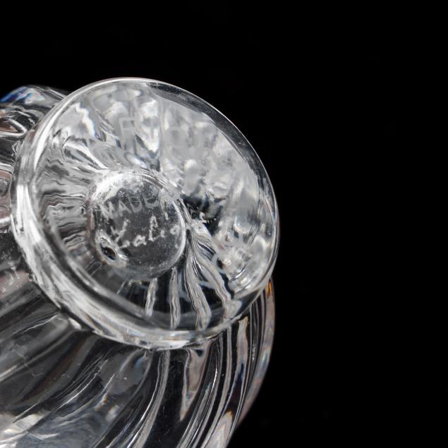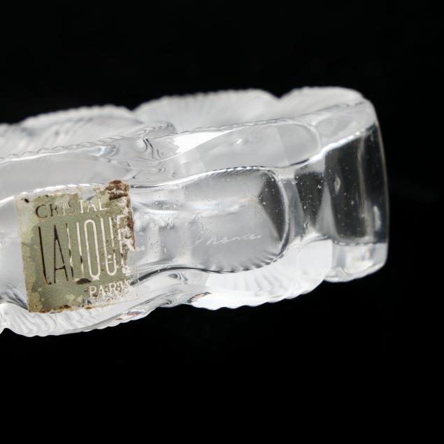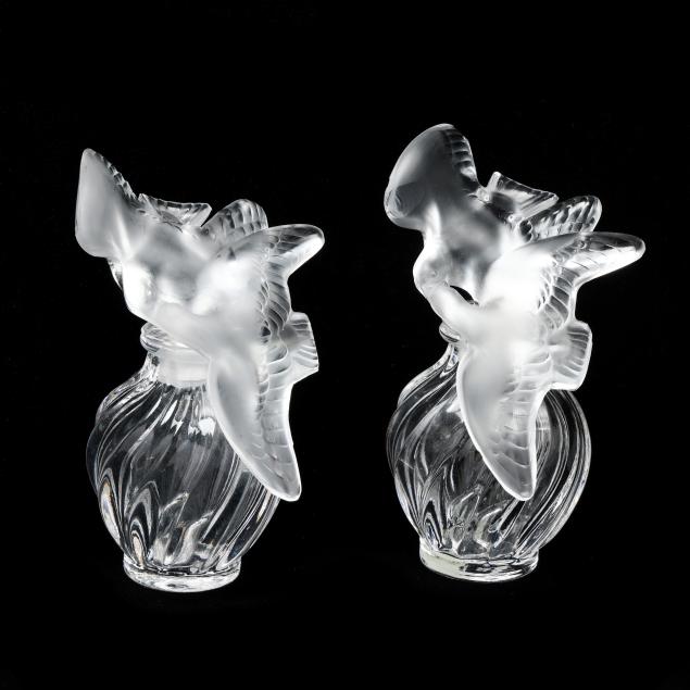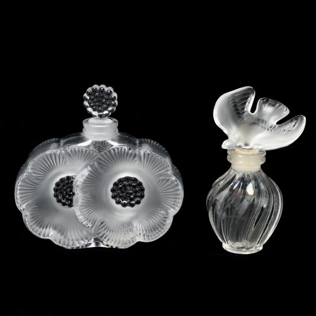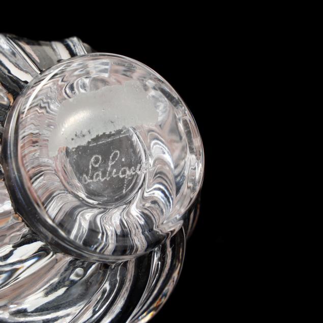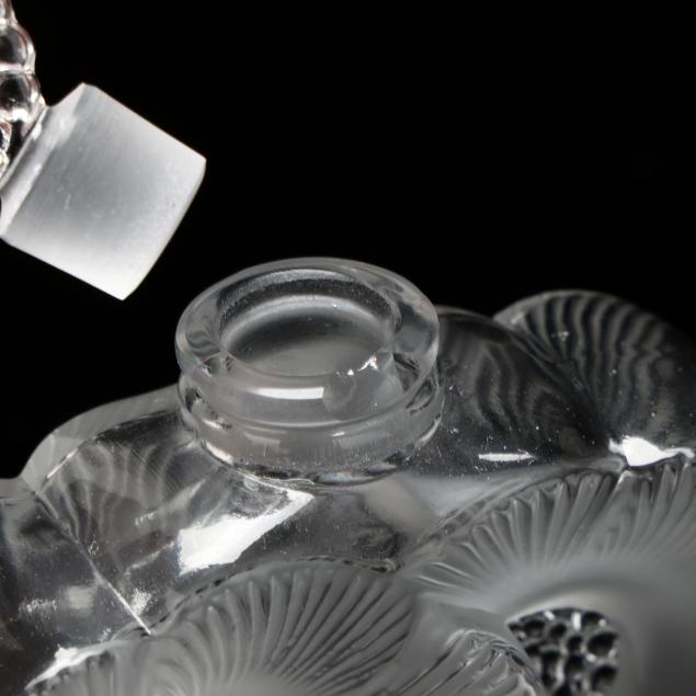 France, late 20th century, clear molded crystal in frosted and polished surface, to include a two flowers bottle with stopper; (2)