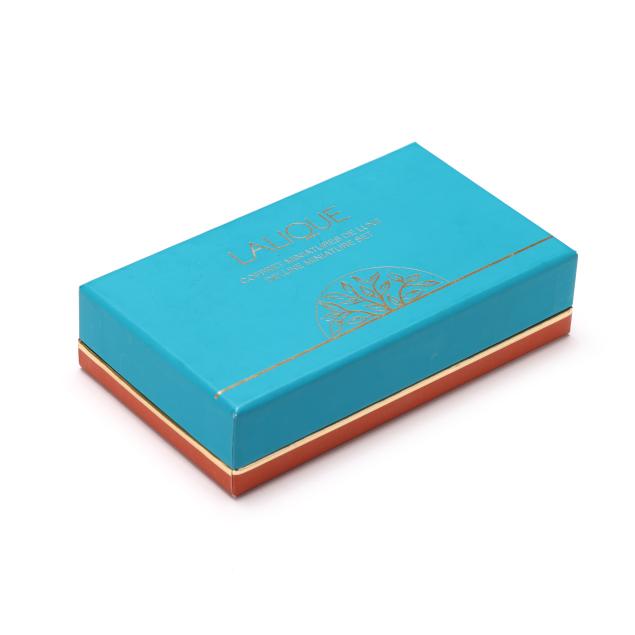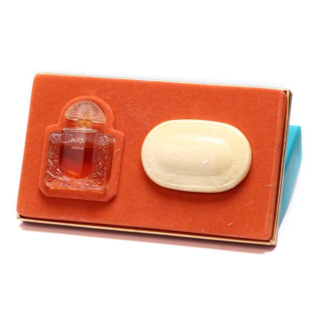 L'Air du Temps single dove bottle with stopper; and a "Deluxe Miniature Set" with small perfume bottle and bar of soap, all marked.