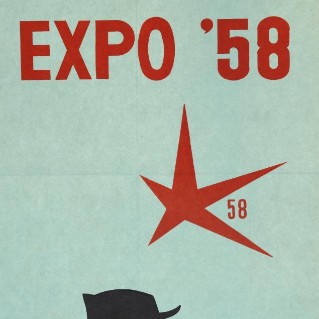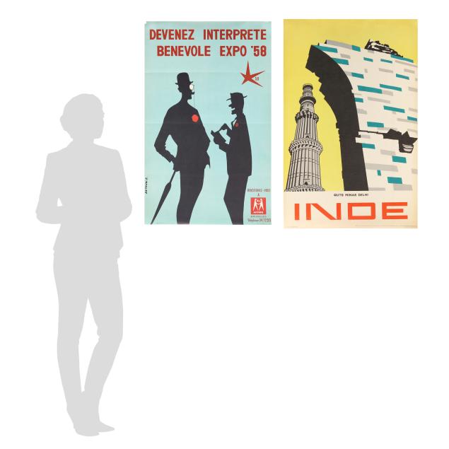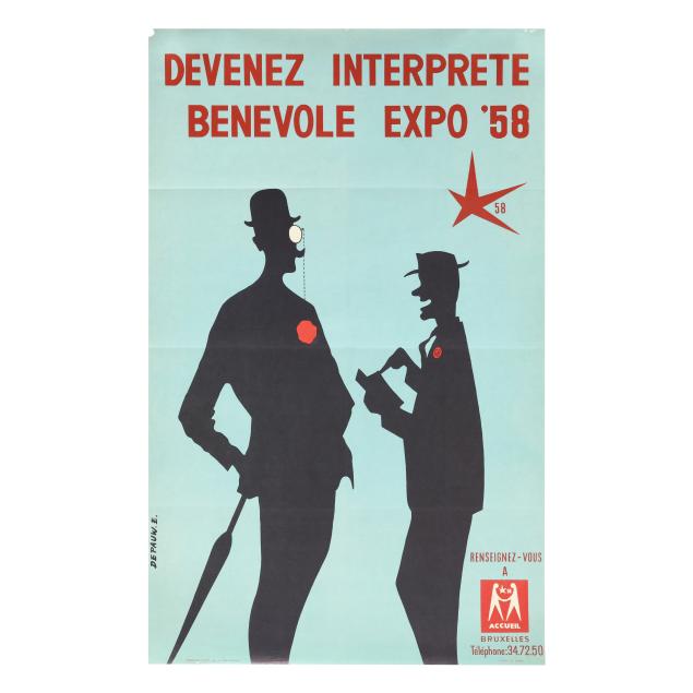Devenez Interprete Benevole Expo '58, 1958, lithographic poster in colors, published in Brussels, unframed (39 1/2 x 24 3/8 in.); and
