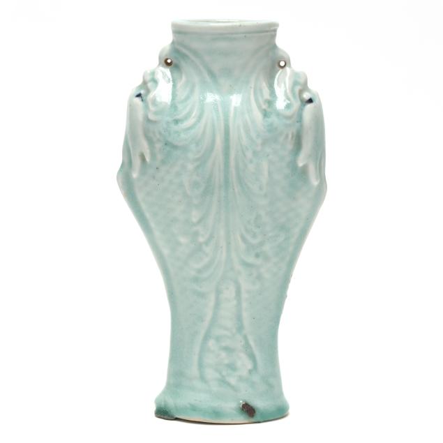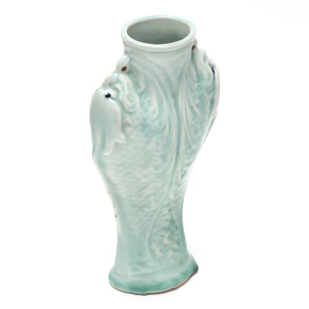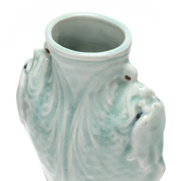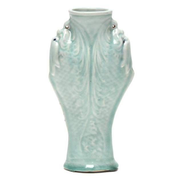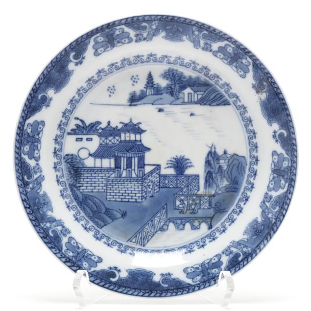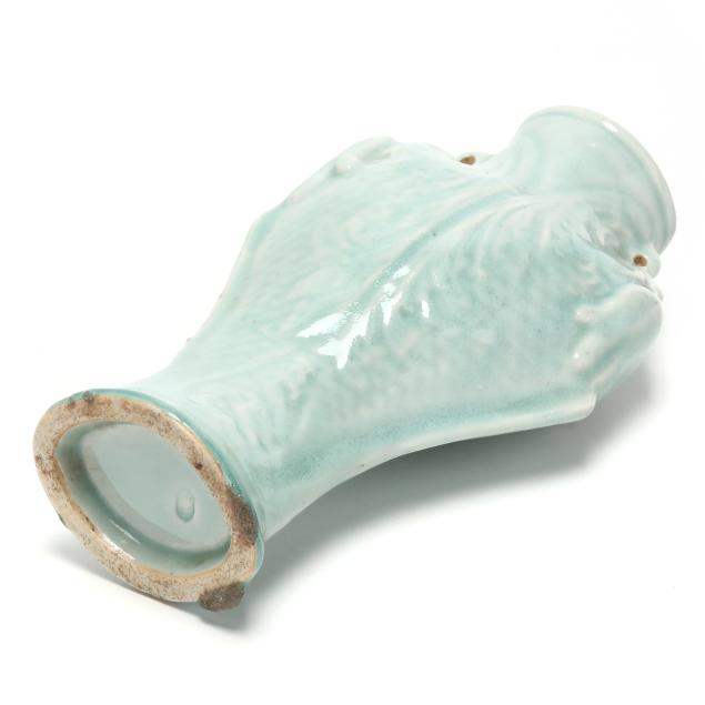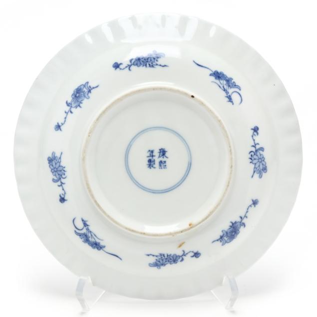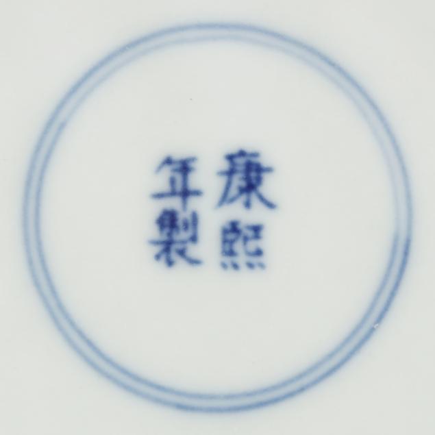 Includes a celadon vase molded with dragon heads to each side, oval impressed mark to underside (10 in.), and a Blue Canton dish with an apocryphal four character Kangxi mark to the underside (8 in. diameter).