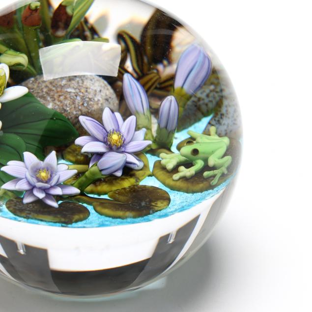 2015, lamp work frog among purple flowers and lily pads, polished pontil, etch signed "Cathy Richardson 2015 W5-012" to outer edge.