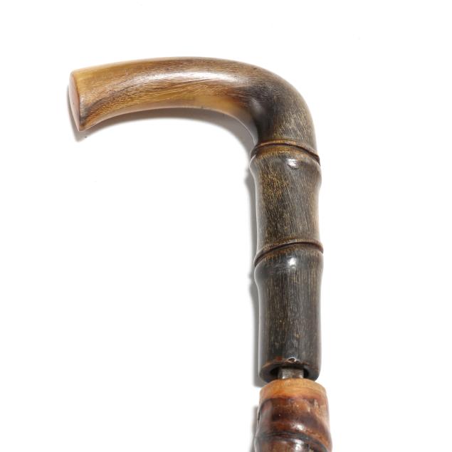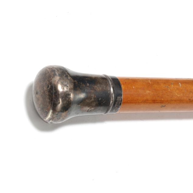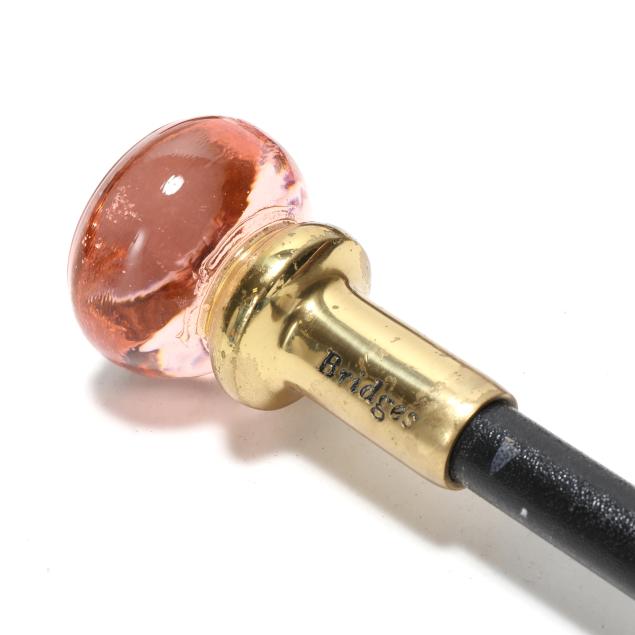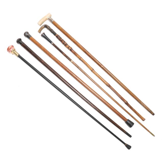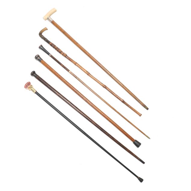 The first with Malacca shaft, mounted with Edwardian silver knob, worn maker's mark with London (1901) hallmarks (33 1/4 in.); the second also with Malacca shaft, engraved Edwardian silver ferrule with mark of J Howell & Co Ltd, Birmingham (1913), monogramed cartouche, beneath a bone handle (35 3/4 in.); third with polished burled rosewood shaft mounted with carved horn knob handle inlaid with 1883 Liberty head nickel (34 1/2 in.); the fourth in oak and bamboo shaft, trumpet form handle with sterling silver ferrule mount marked "E. C. Co. / STERLING" (35 1/2 in.); the fifth a sword cane with bamboo shaft with carved horn handle, concealing a sword, marked "SOLINCEN" (33 1/4 in.); and a vintage Bridges pink glass knob form with ebonized shaft, engraved "Bridges" to the brass mount (36 in.).