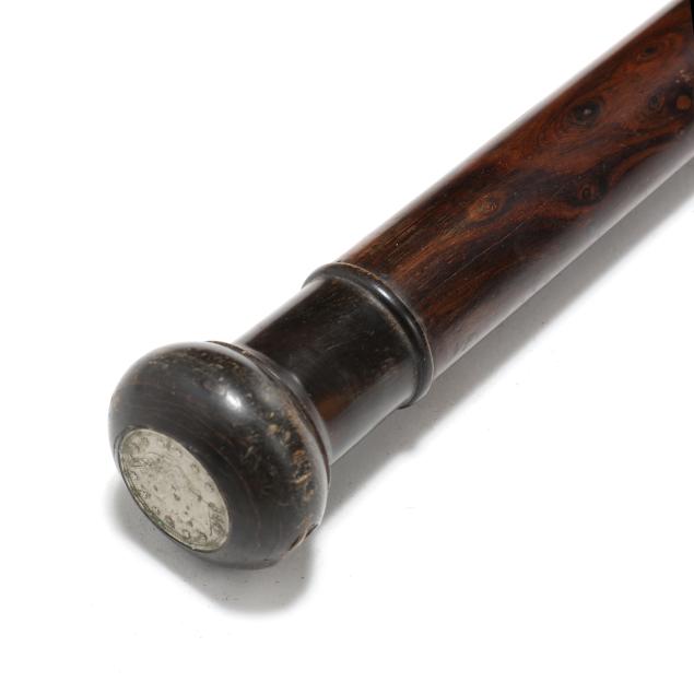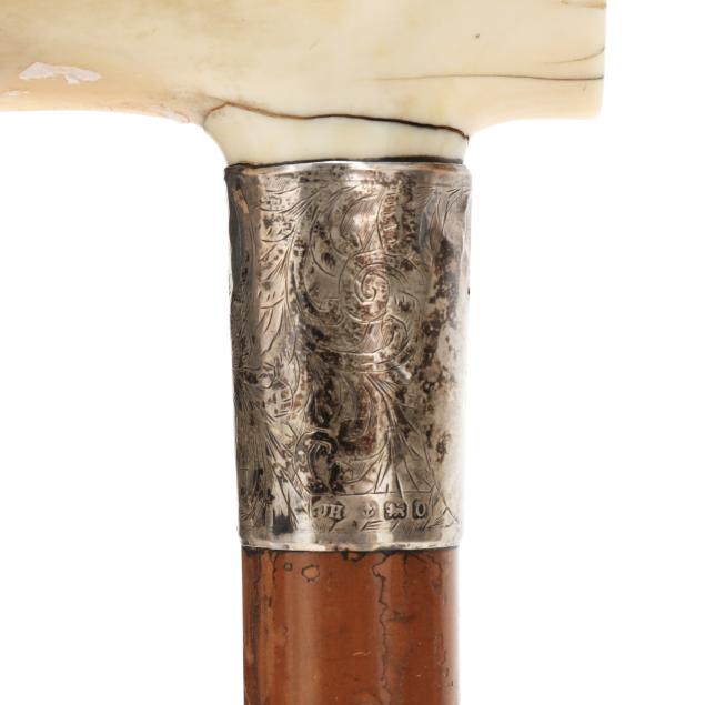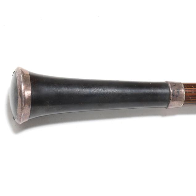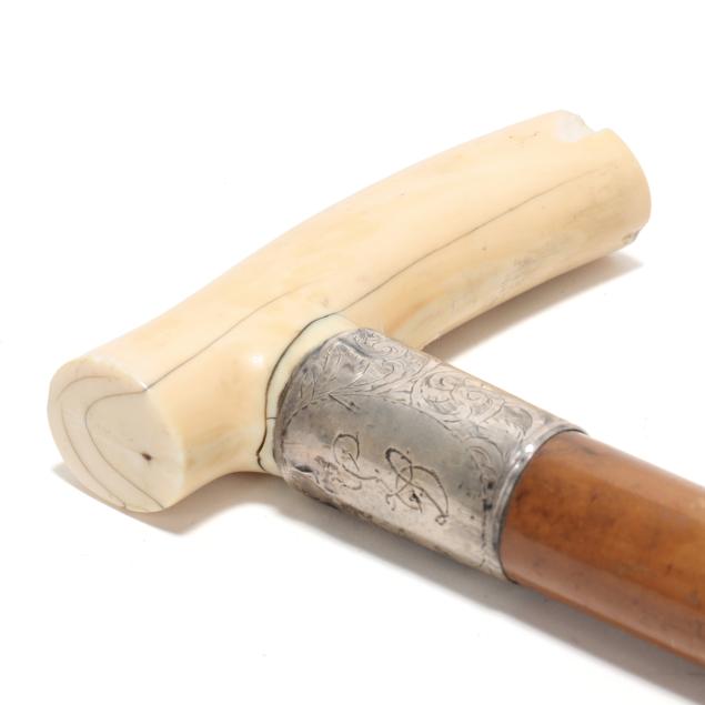 From the Estate of the late Carroll Wayne "Denny" Dennis, Holly Springs, NC Some surface wear from handling, age and use; bone handle with hairlines and chips; some denting and tarnish to silver; sword form lacking upper ferrule mount beneath handle; some bruising to glass.