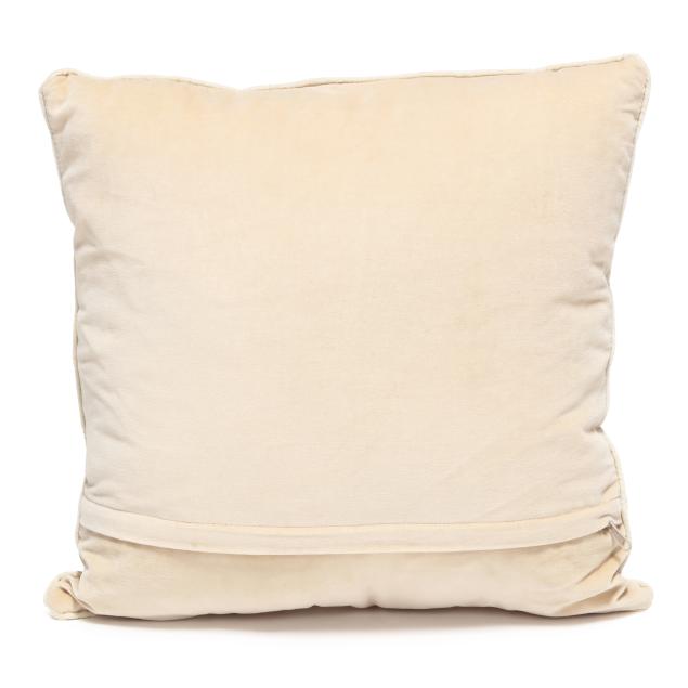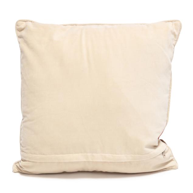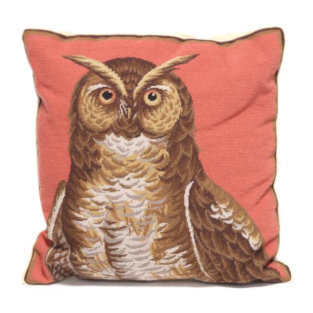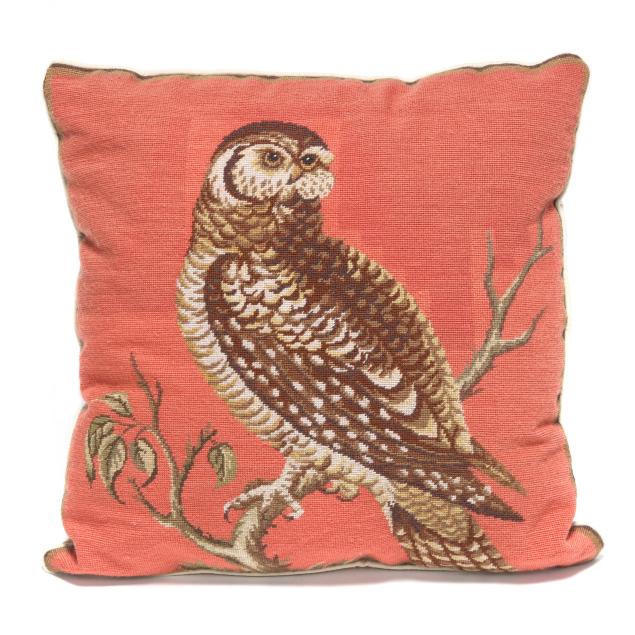 Wool on needlepoint canvas with cream colored cotton velvet backs and piping edging, with hidden zippers, with poly-fill inserts, to include: backward facing perched owl on salmon pink background; and large-scale owl face on salmon-pink background.