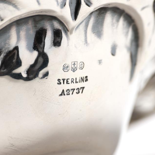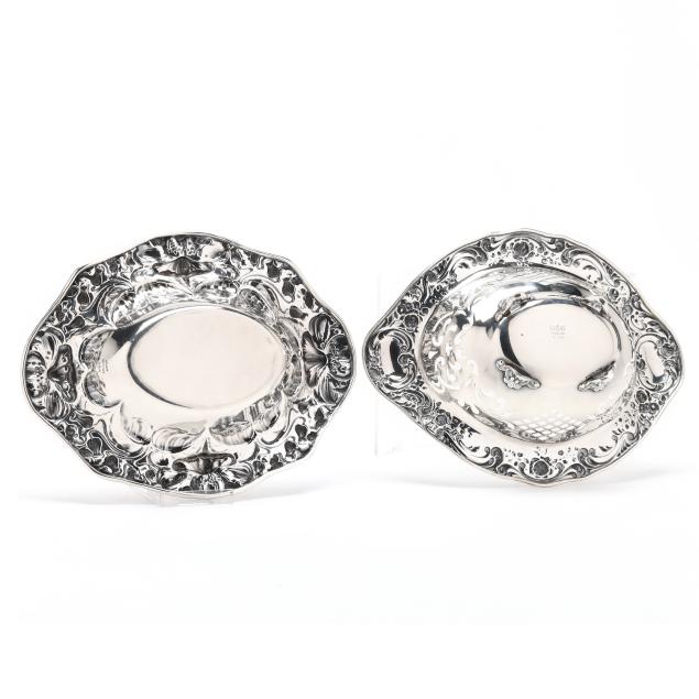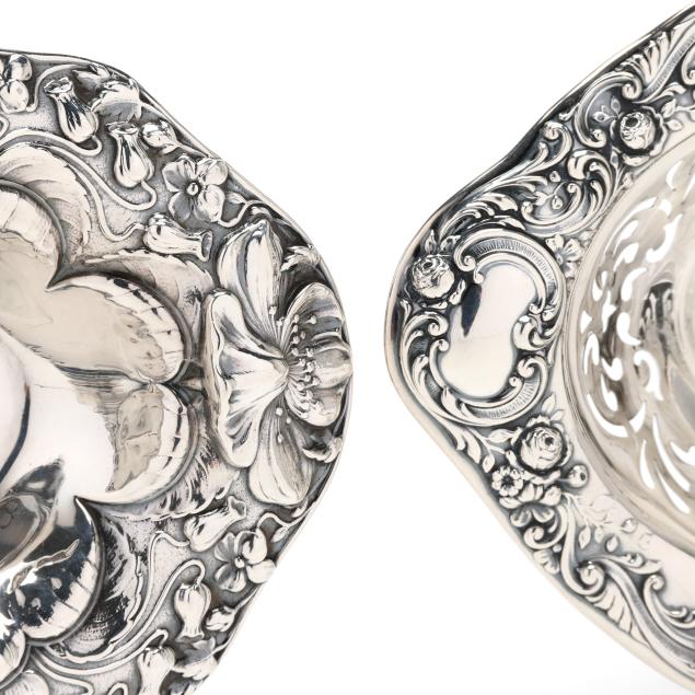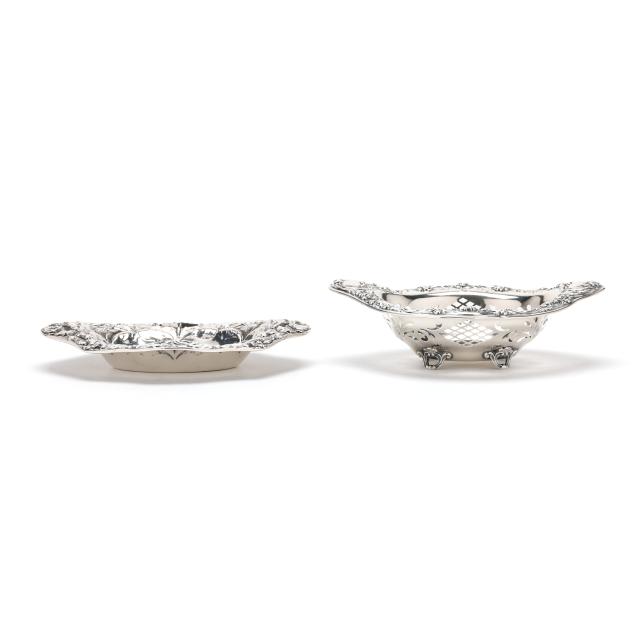 The first, an art nouveau style bon bon bowl, pattern number A2737, with repousse floral decoration to the rim (5 1/2 x 7 in.); the second, a bon bon basket, pattern number A290, with a reticulated well, rocaille decorated rim, raised on four cartouche feet (2 x 7 1/4 x 5 1/2 in.); neither monogrammed.