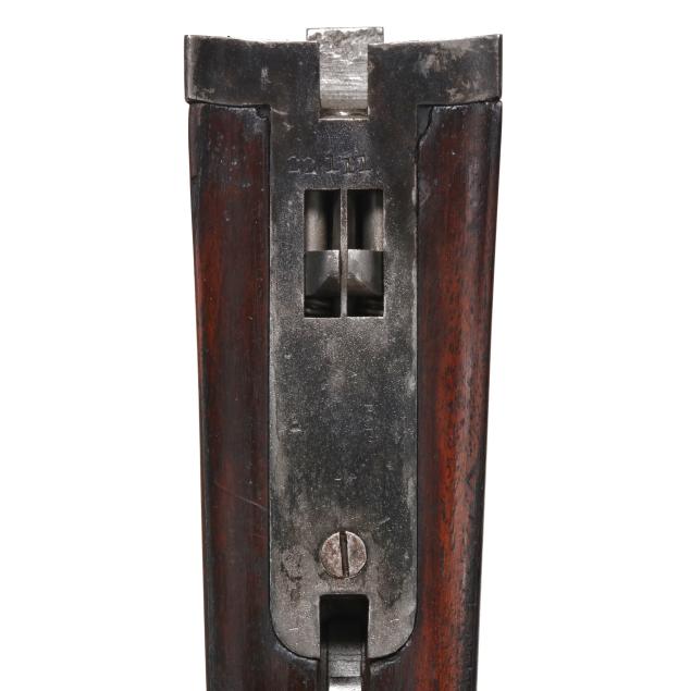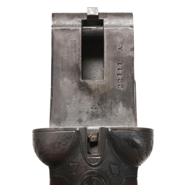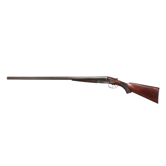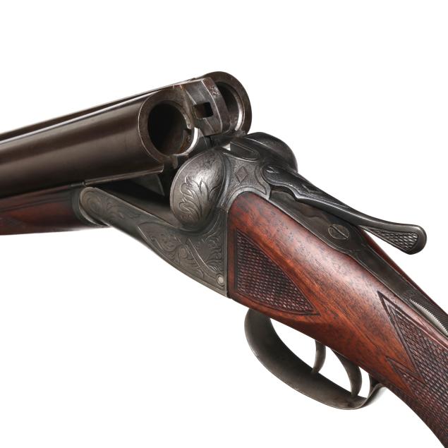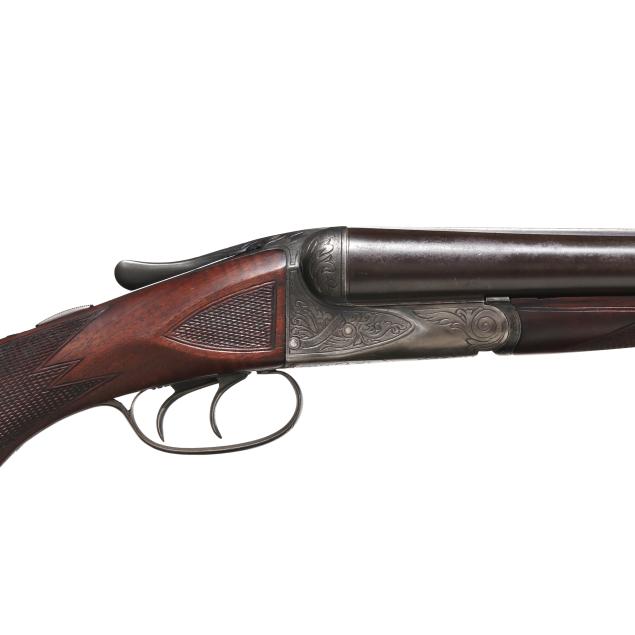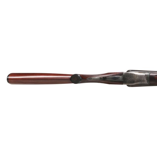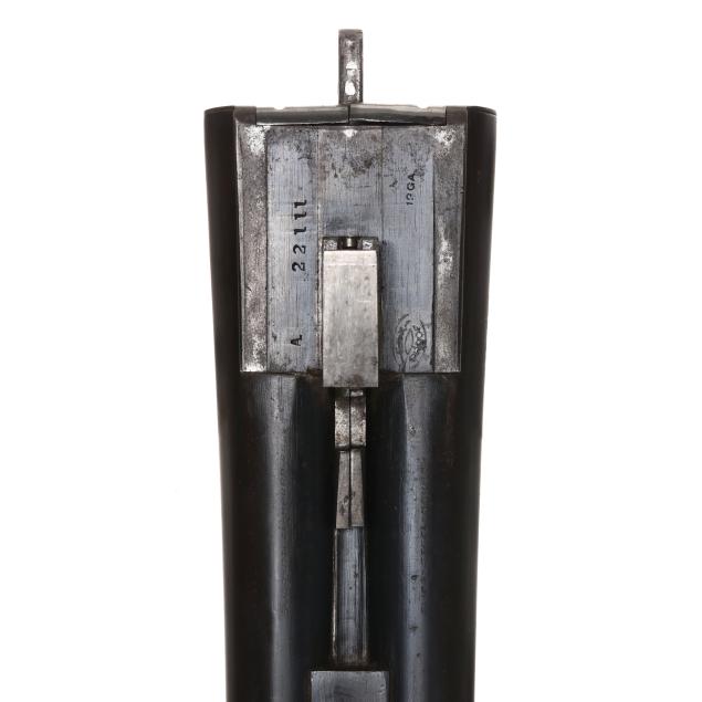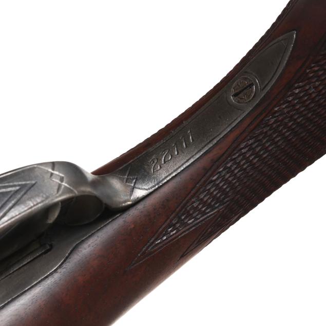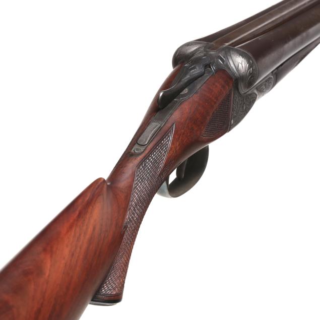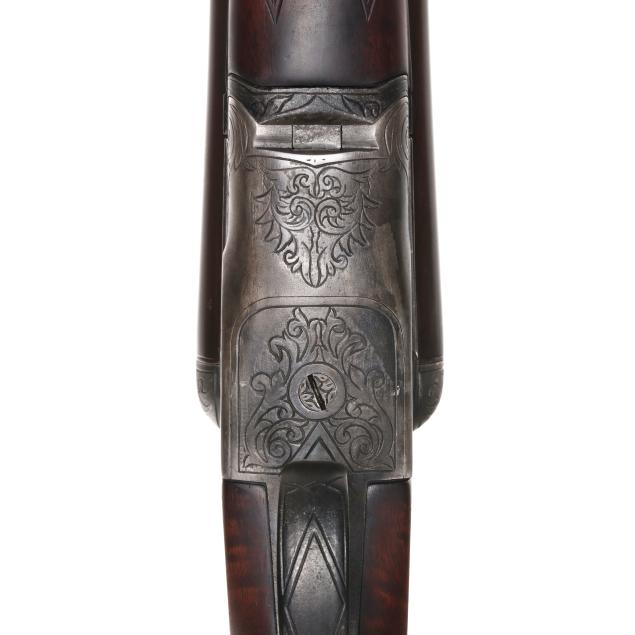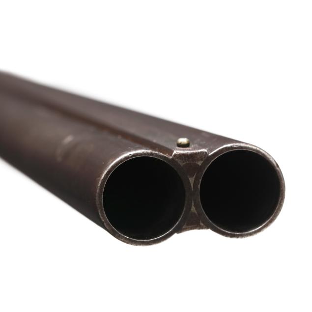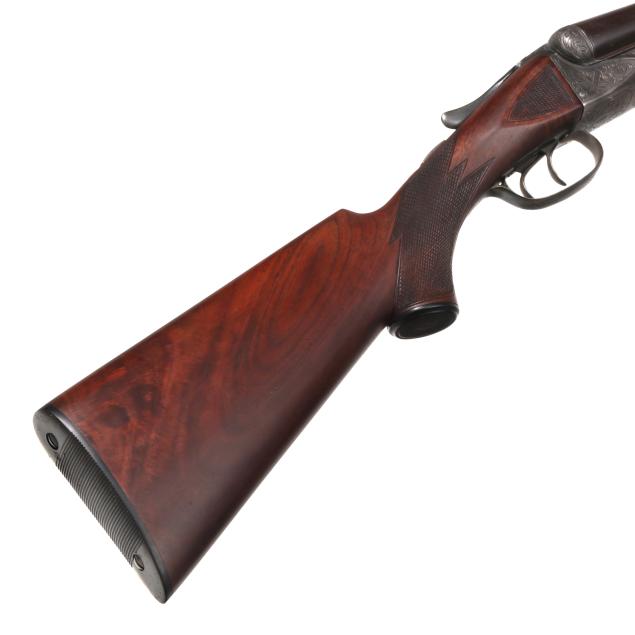 Overall good estate condition, bores are shiny with scattered light to moderate pitting most significantly in the last third of their lengths, scattered small pitting on exterior, two shallow dent sat 2:00 on right barrel 6 1/2 in. and 1 1/2 in. from muzzle, barrel ring resonate yet somewhat muted with a lower pitched tone, handful of small nicks in edges of top rib, deep relief cut engraving remains sharp, receiver patina is a dull dark silver coin appearance, very slight screw slot damage, stock finish is healthy and attractive with a satin sheen indicating a prior refinish, some attractive figuring present in buttstock, checkering possibly recut by a professional with skill, checkered cheek panels present typically found on a B grade or higher gun, all checkering remains clean and sharp.