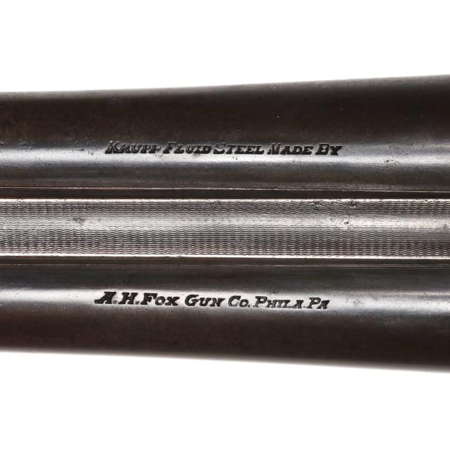 Matching serial number 22111 present on water table, barrel flats, forend iron and trigger guard, text of KRUPP FLUID STEEL MADE BU A.H. FOX GUN CO. PHILA. PA present on 29 7/8 in. barrels with matted top rib and single bead, engrave boxlock action, ejectors, double triggers, automatic safety, checkered walnut buttstock with capped pistol grip, checkered splinter forend, factory buttplate.