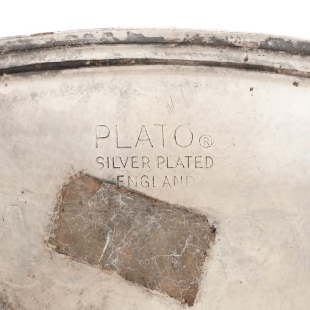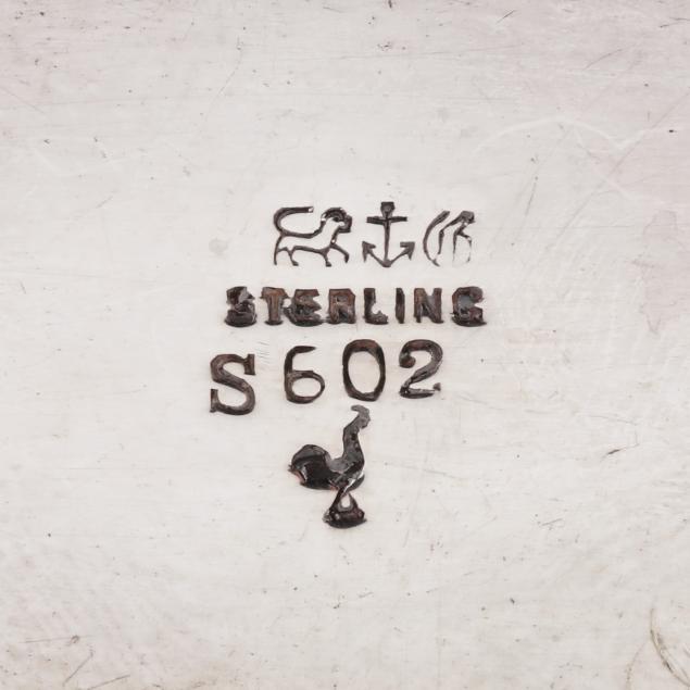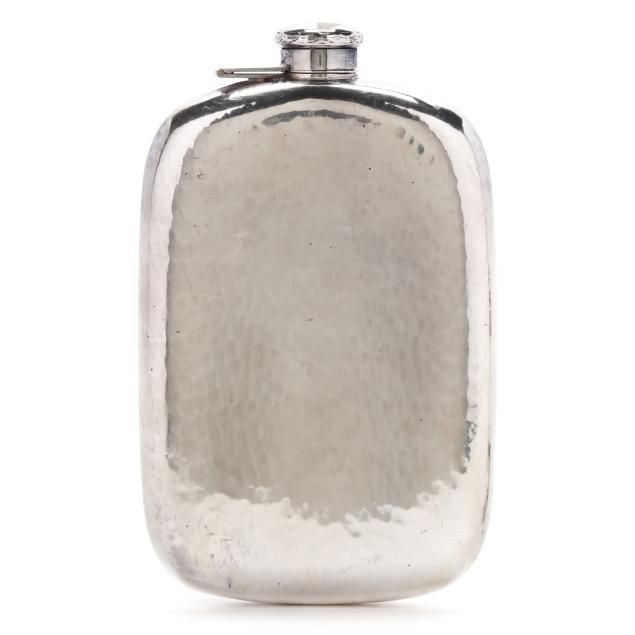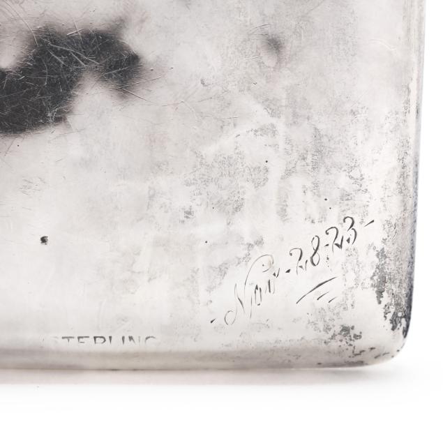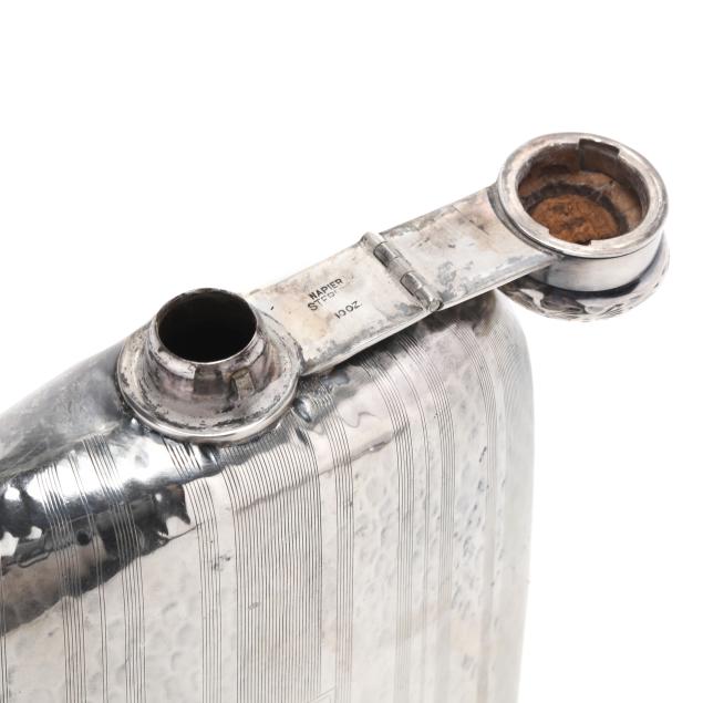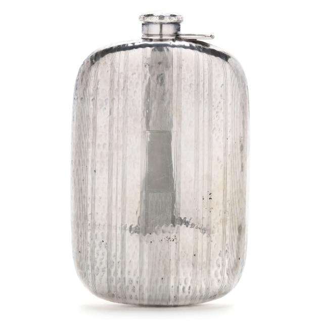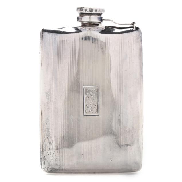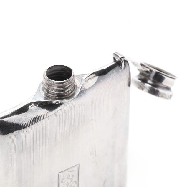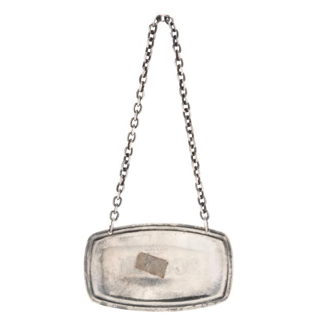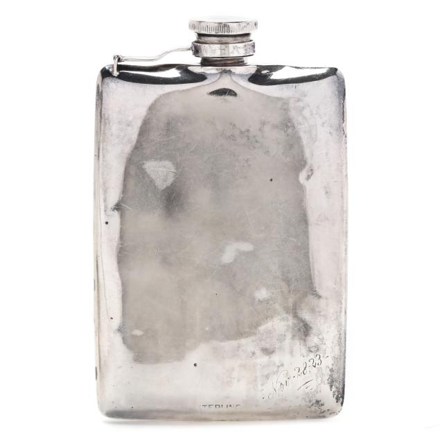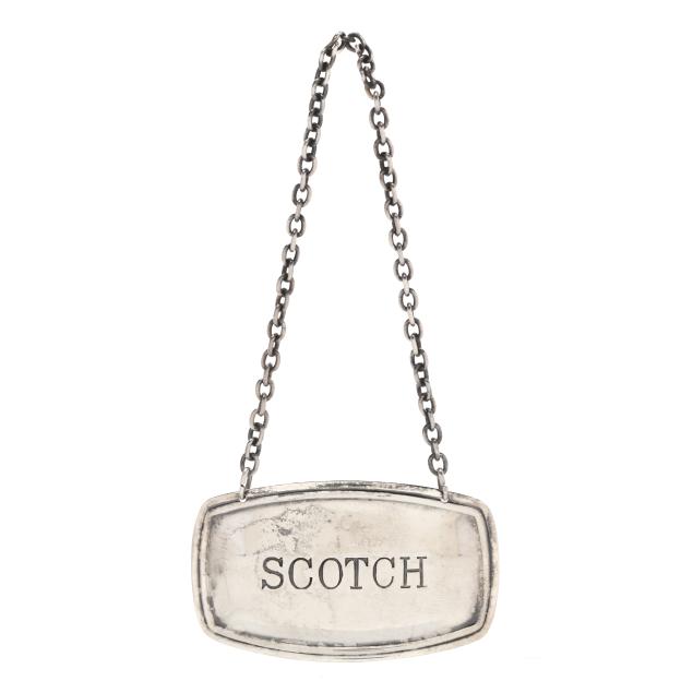 The largest, mark of Napier, featuring a hammered and engraved surface, not monogrammed (6 1/2 x 4 in.); the next, marked "Sterling", featuring engraved striations to the surface, dated. "Nov 28-23", and monogrammed; the third, a sterling mounted glass bottle, mark of Gorham, pattern number S602, with gold wash to the interior, not monogrammed; and a silver-plated liquor tag engraved "Scotch", made in England.