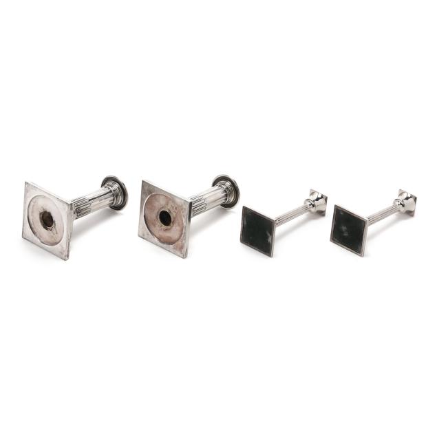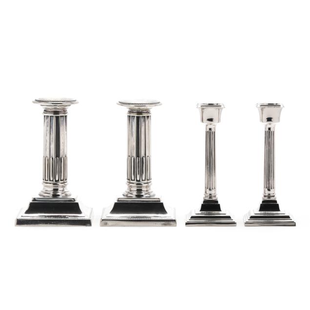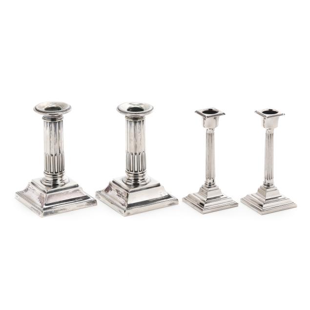 Two Pairs of Small Columnar Silver-Plated Candlesticks