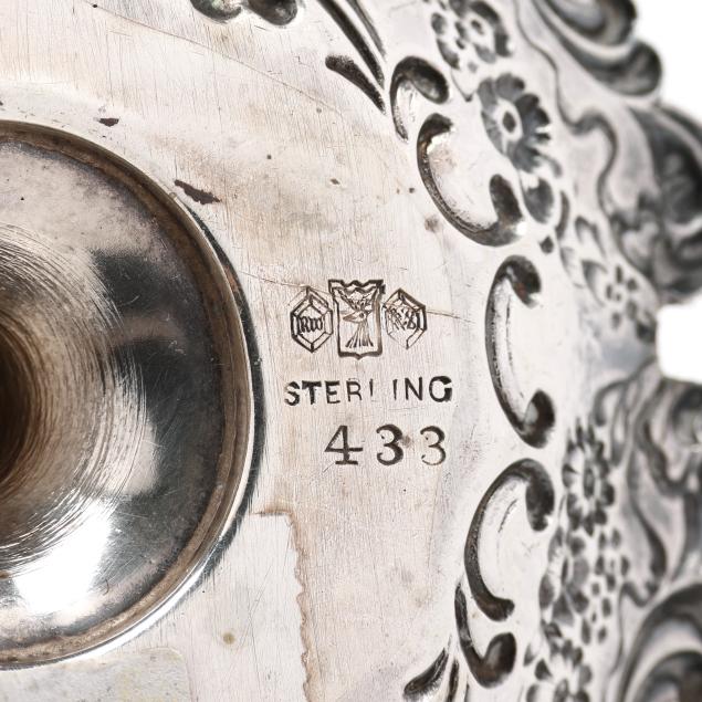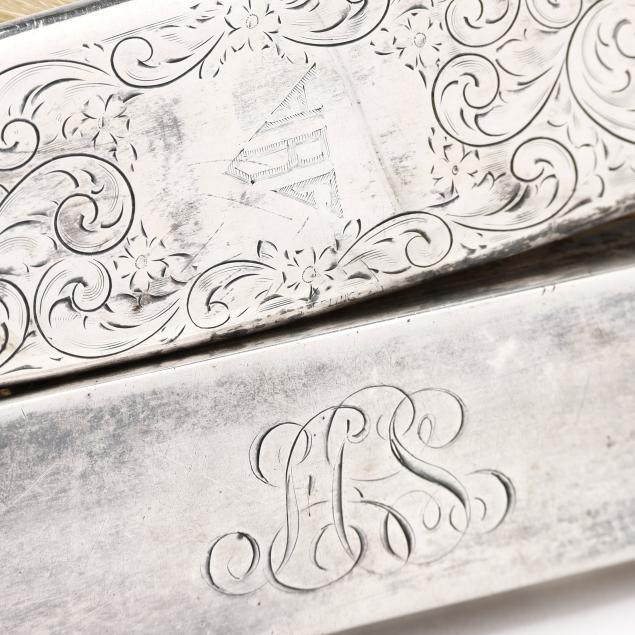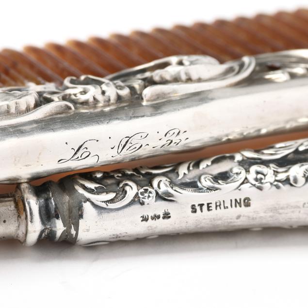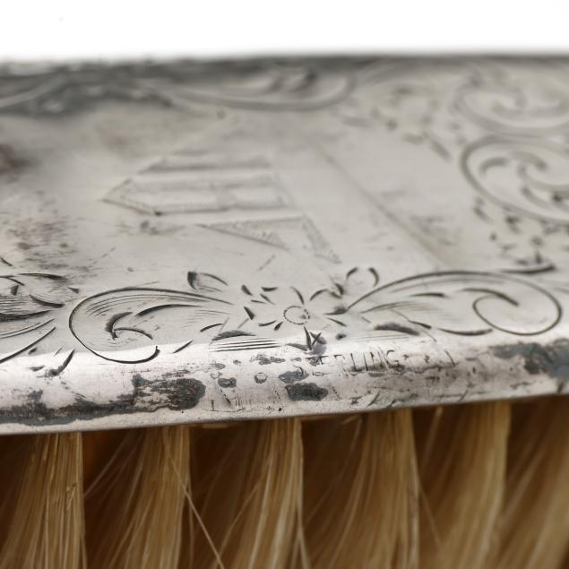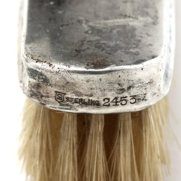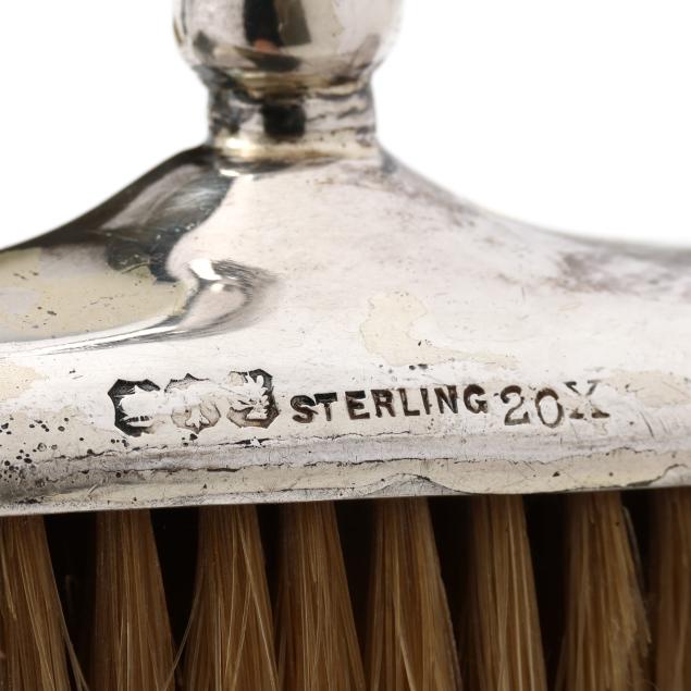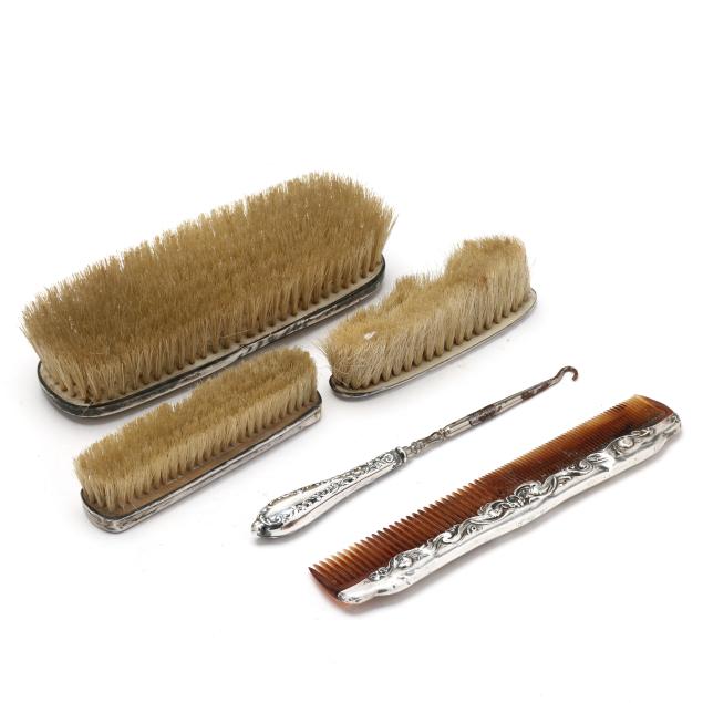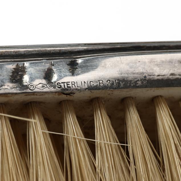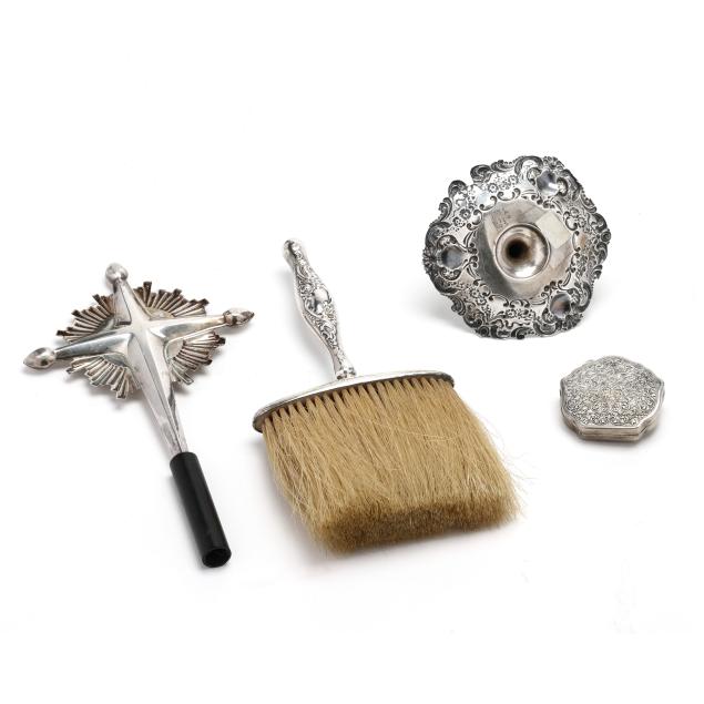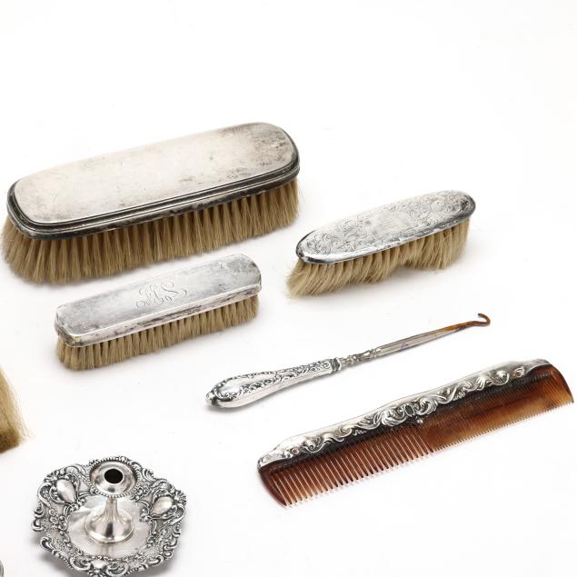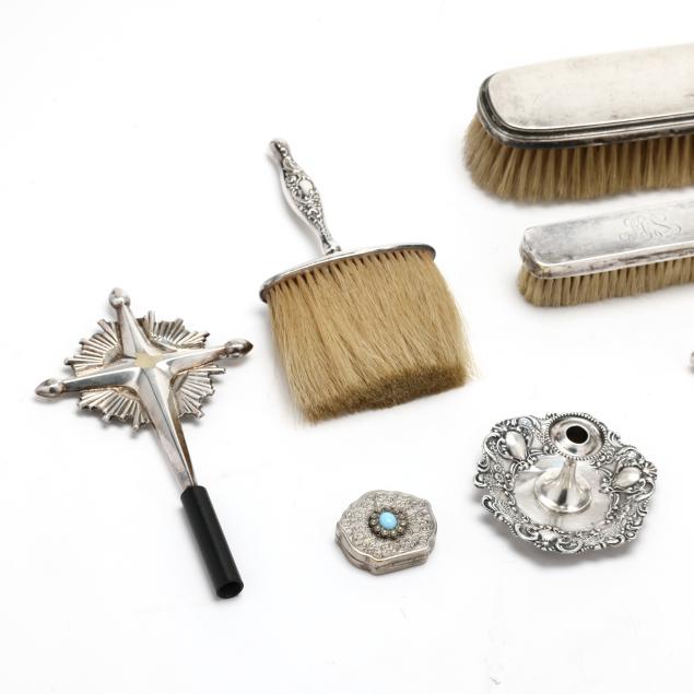 Includes a (3) sterling clothes brushes; a sterling hat brush; a sterling button hook and comb; a Gorham sterling taper stick; a Gorham sterling Christmas tress topper; and a jeweled silver plated pill box; various maker's marks and patterns; some monogrammed.