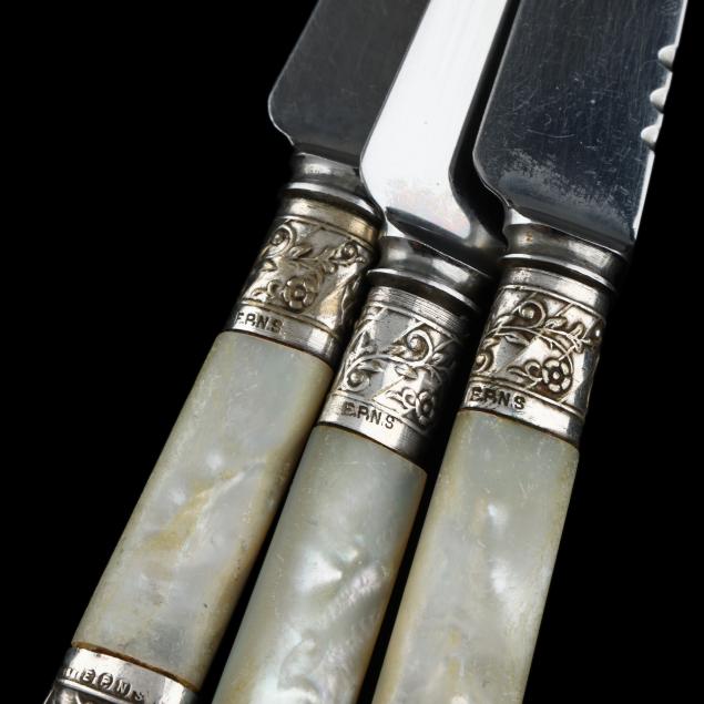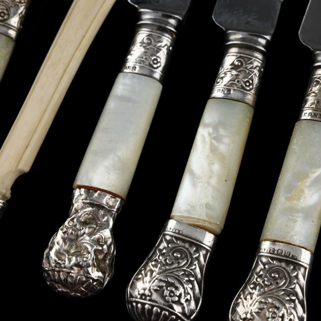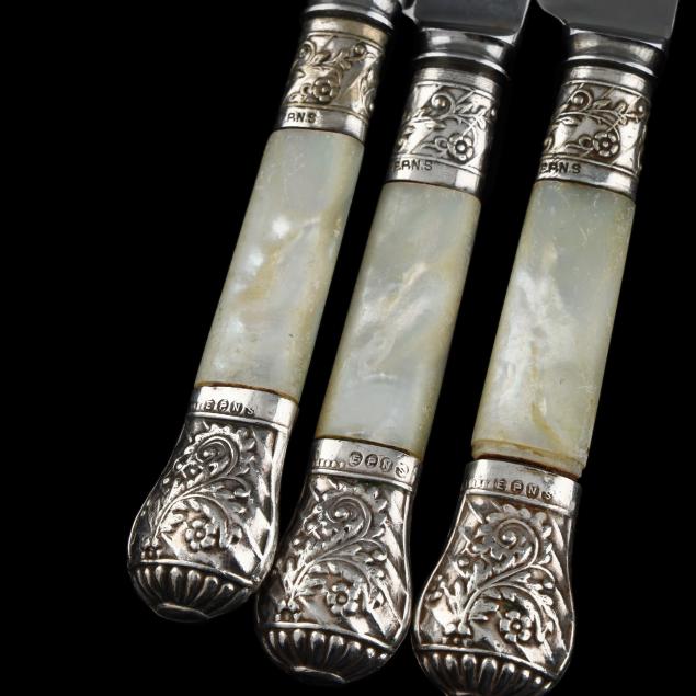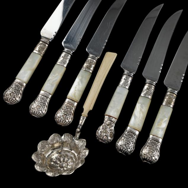 Includes (6) English steak knives, with silver-plated and mother of pearl handles, the stainless steel blades with mark of Marhill (8 3/4 in.); and a Continental silver-plated sugar sifter with bone handle; not monogrammed.