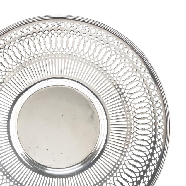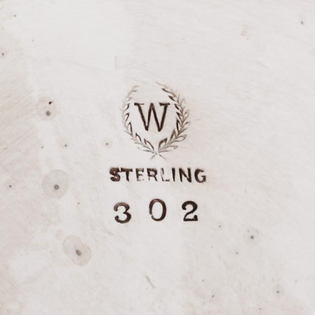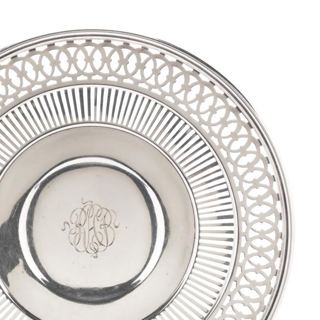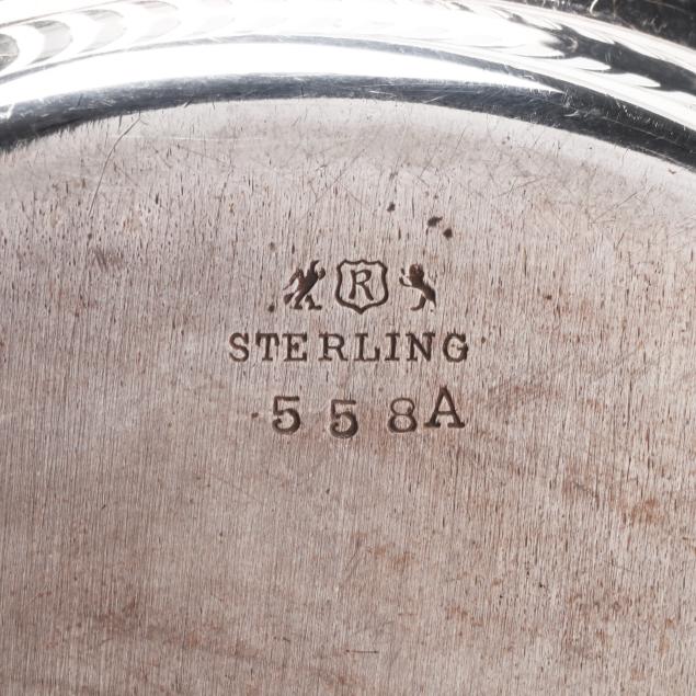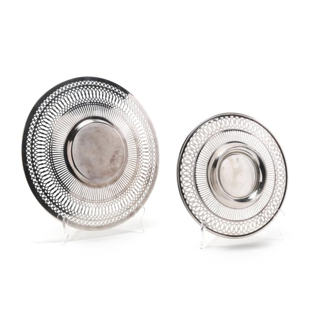 The smaller, mark of Woodside, pattern number 302, a footed form with script monogram to the well (9 in. dia.); the larger, mark of Reed & Barton, pattern number 558A, not monogrammed (11 in. dia.)