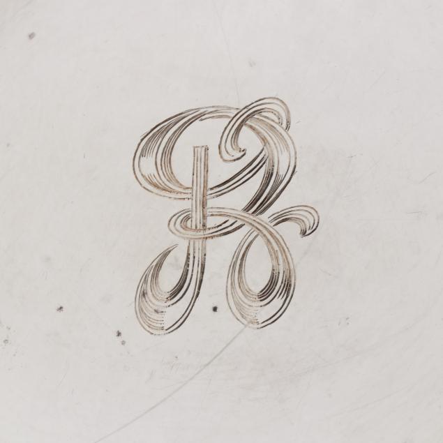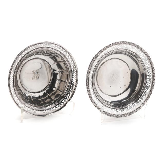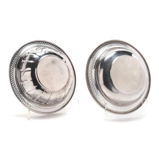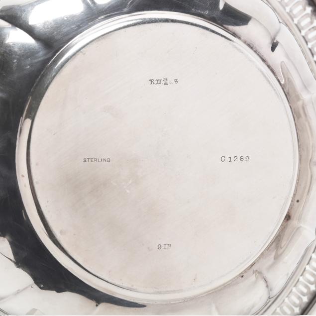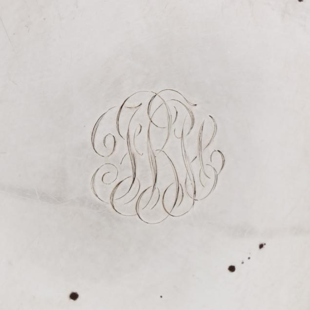 Chased Romantique, pattern number S132, monogrammed (9 in. dia.); the second, mark of Wallace, pattern number C1289, with a lobed well, monogrammed (9 in. dia.).