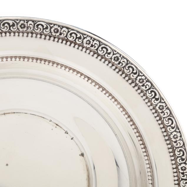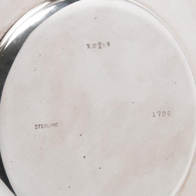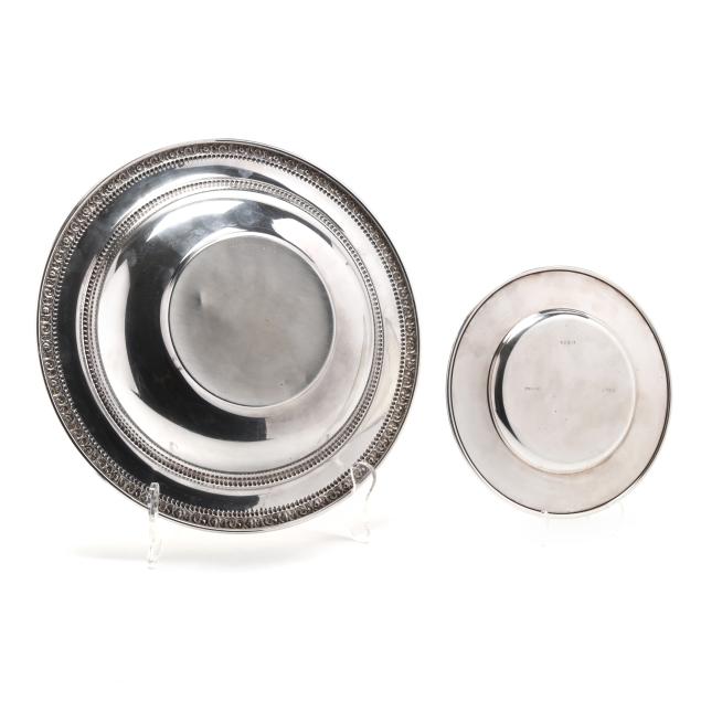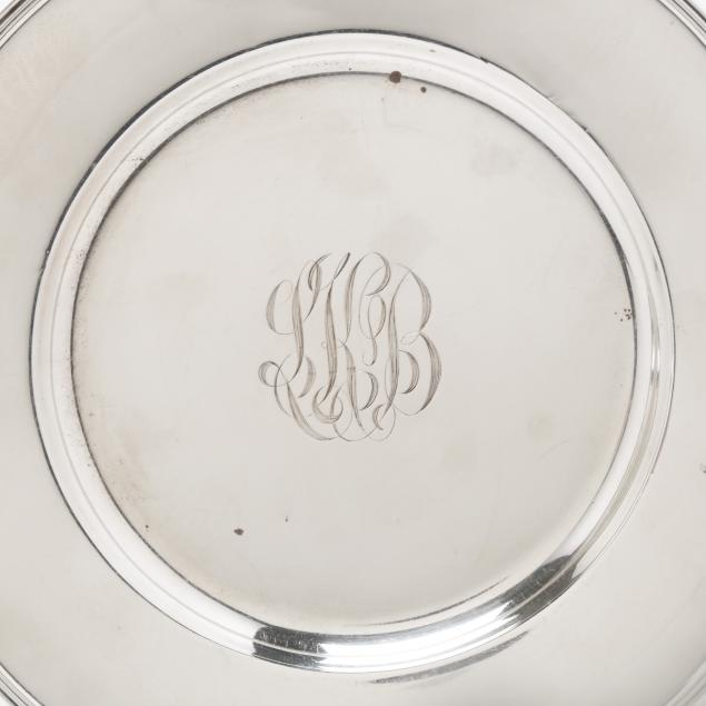 The bowl, pattern number 4380, with bead course and repousse rim, not monogrammed (10 in. dia.); the bread plate, pattern number 1706, monogrammed (6 3/8 in. dia.).