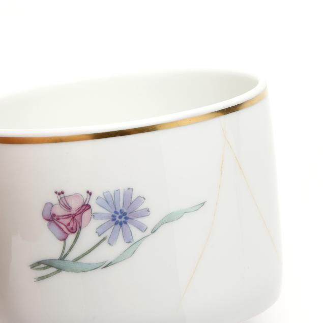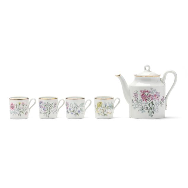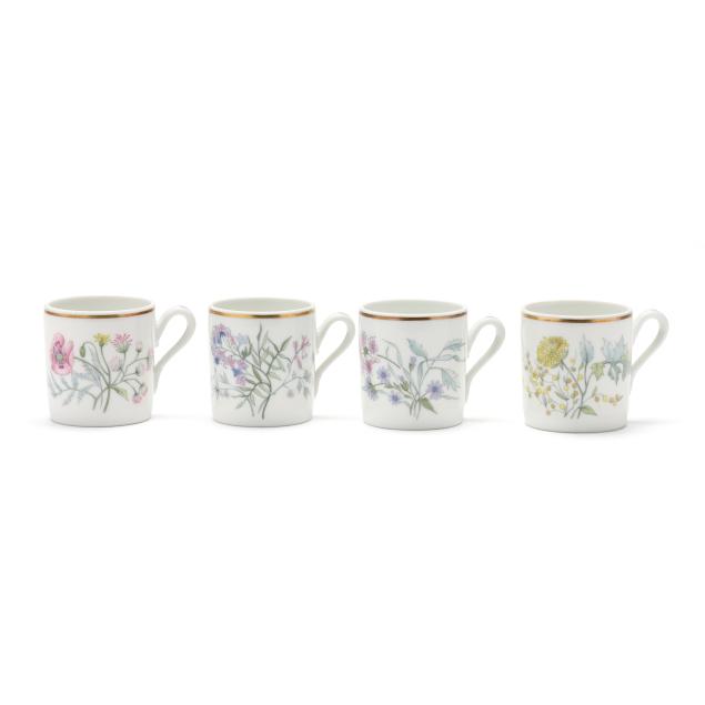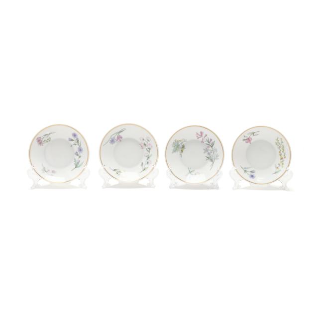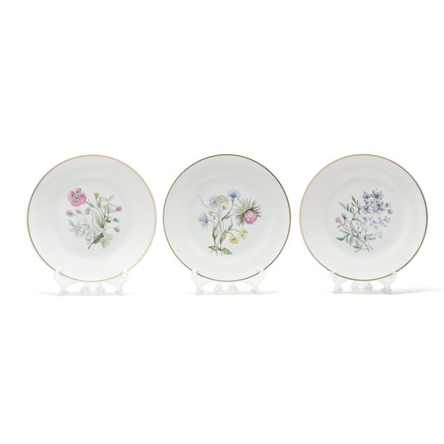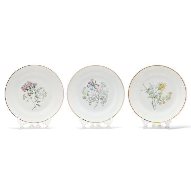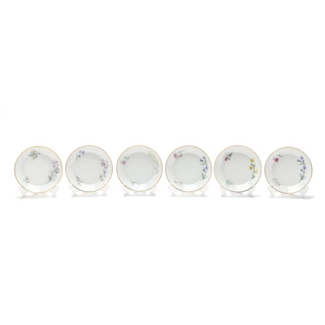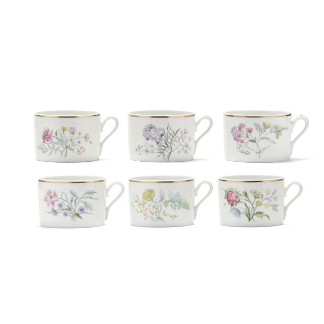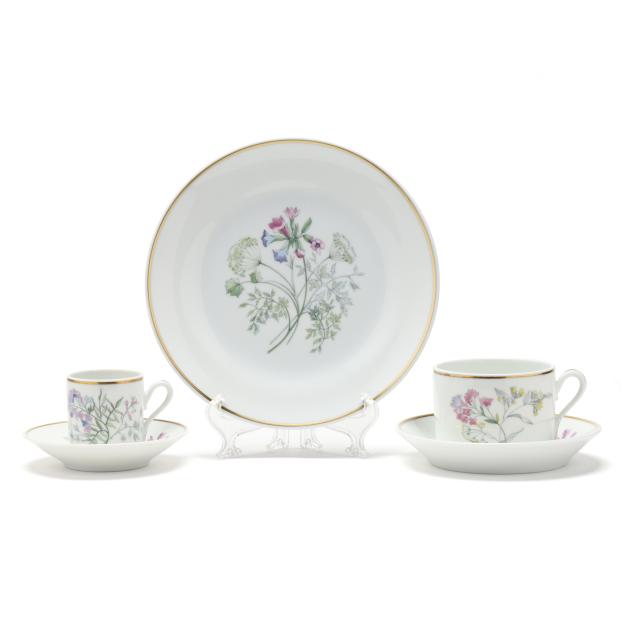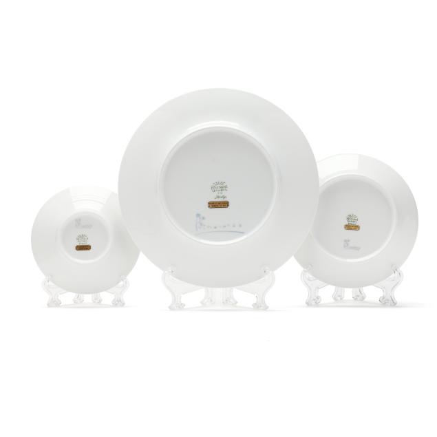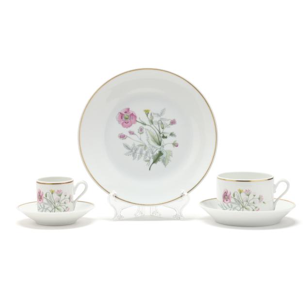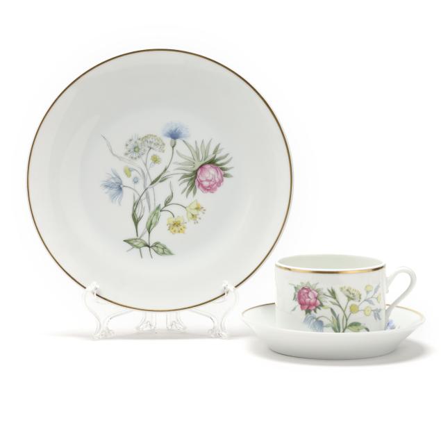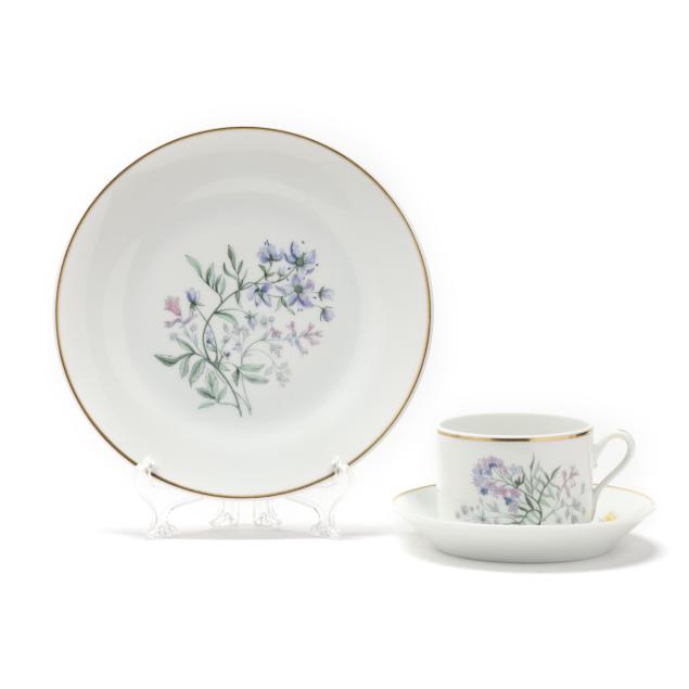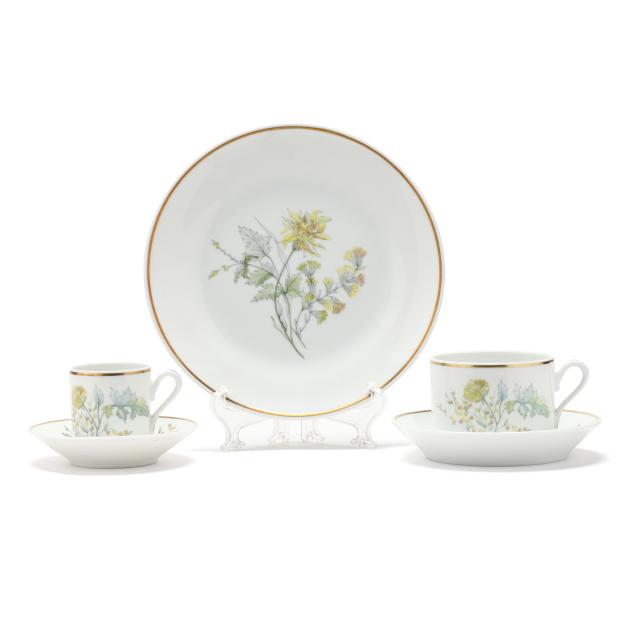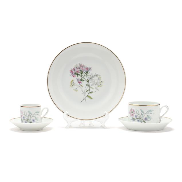 A few plates and cups with minor gilt rubbing to trim; one flat cup with few toned hairlines; otherwise good estate condition.