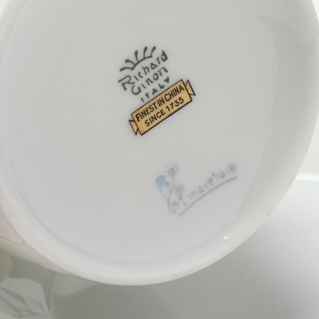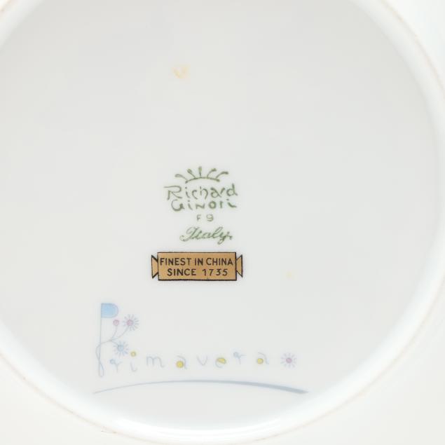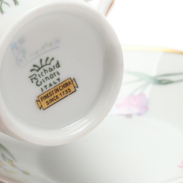 (84) pieces, Italy, late 20th century, to include a mini coffee pot with lid (5 1/2 in); (32) dessert plates in (6) different floral patterns (8 in.); (15) flat cups (2 1/4 in.) and (20) saucers (5 1/2 in.), the cups in (6) floral patterns and the saucers in (5) floral patterns; and (8) flat demitasse cups (2 1/8 in.) and (8) saucers (4 3/4 in.), the cups and saucers in (4) floral patterns, all pieces with company backstamps to underside.