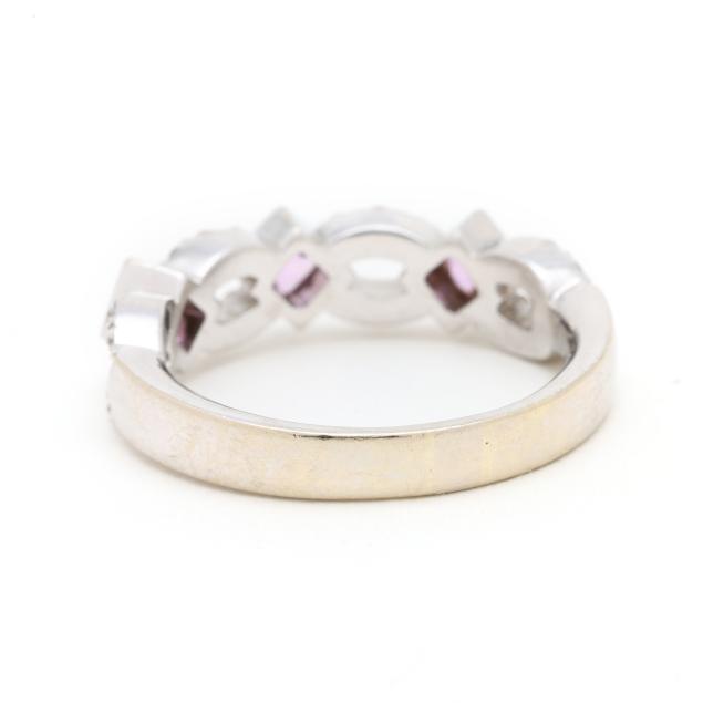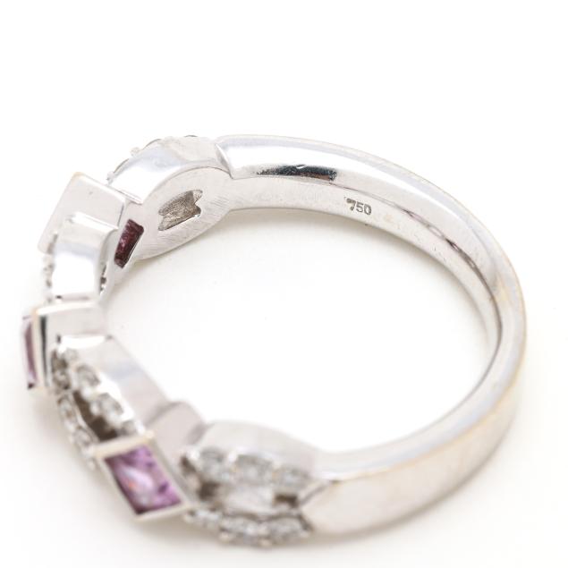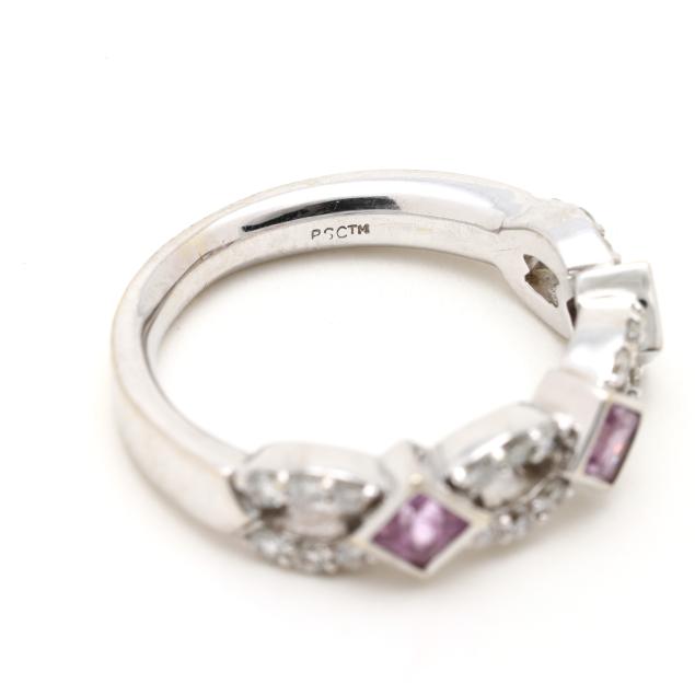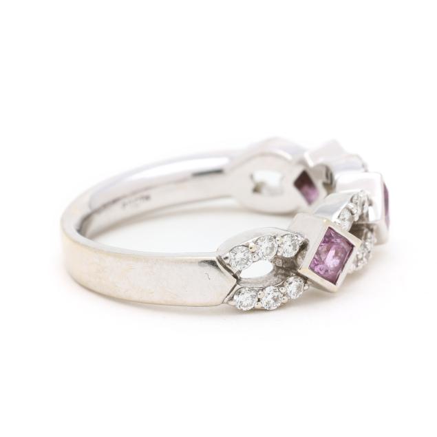 In an infinity design, bezel set with diagonal princess cut pink sapphires (3 x 3mm) weighing approximately .55 total carat, and bead set with full cut round diamonds weighing approximately .36 total carat (G-H color, VS2-SI1 clarity), completed with a flat shank, stamped 750 / PSCTM.