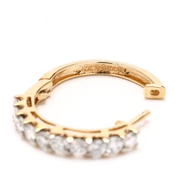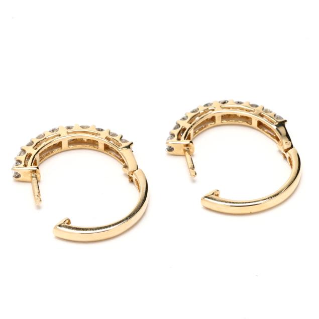 The hinged hoop earrings prong set with full cut round diamonds weighing approximately 2.25 total carats (H-I color, SI1-SI2 clarity), completed with posts, signed and stamped 14K.