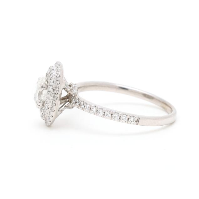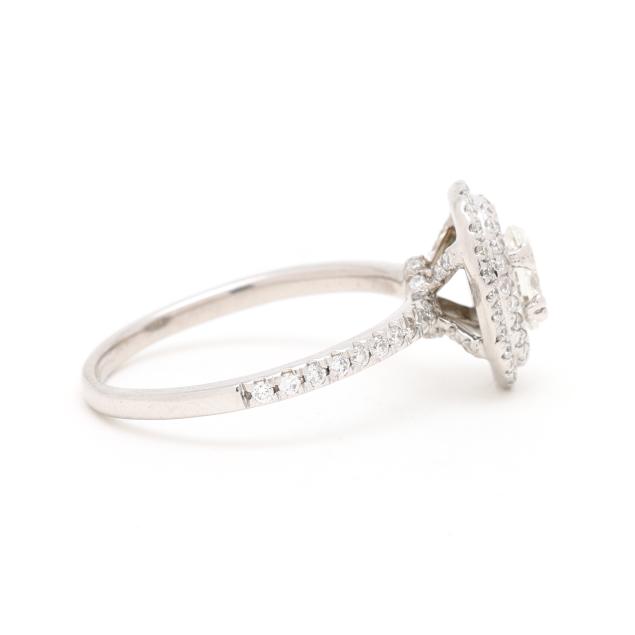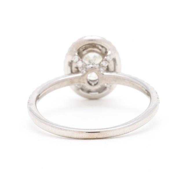 Set to the center with an oval cut diamond weighing approximately .32 carat (H color, SI1 clarity) and with double halo and shoulders set with full cut round diamonds weighing approximately .50 total carat (F-G color, VS1-VS2 clarity), on a delicate high polish shank, testing 14KT.