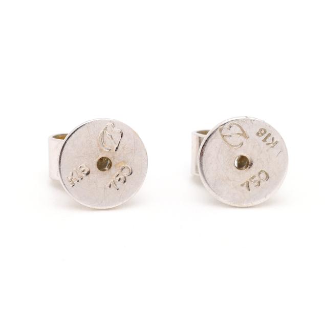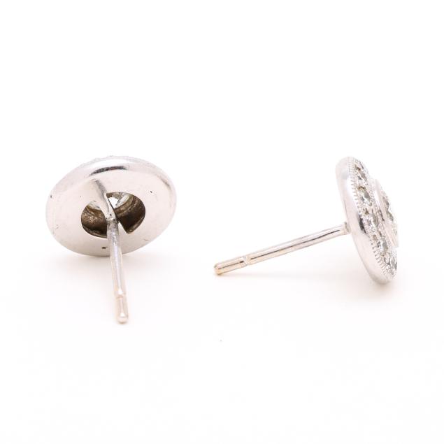Centered on a bezel set round brilliant cut diamond (4.1mm) within a halo of bead set full cut round diamonds, completed with a friction post and push back, earrings XRF testing 18KT, backs stamped K18 / 750 / B. The total diamond weight is approximately 1.00 carat (H-I color, VS2-SI1 clarity).