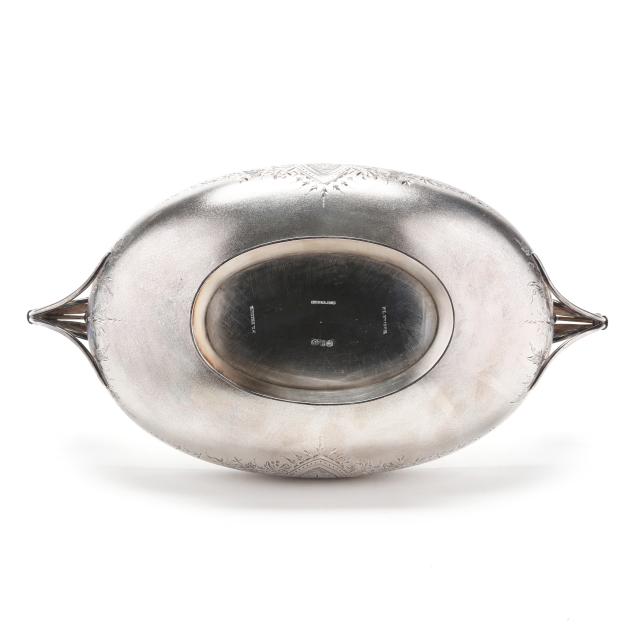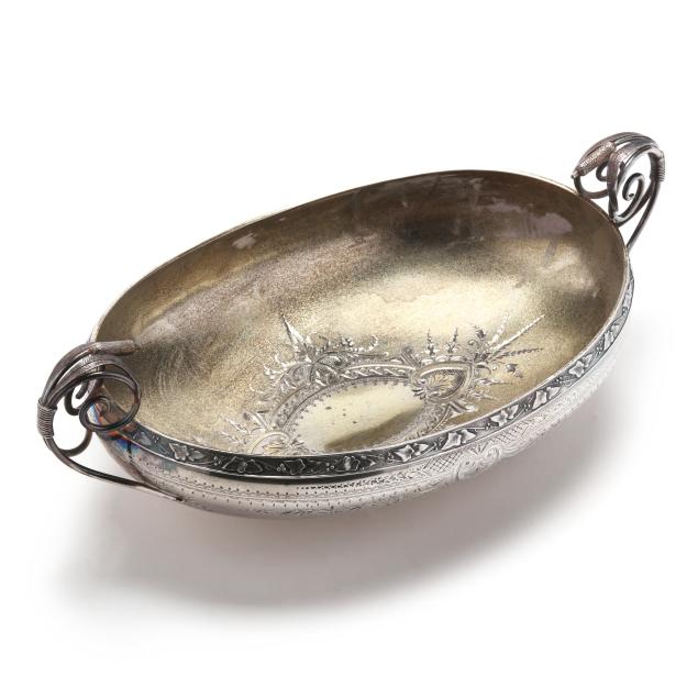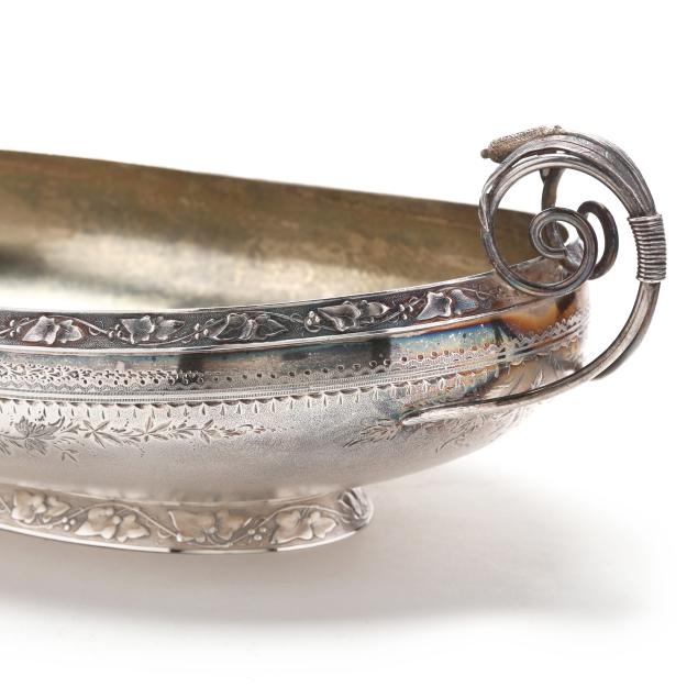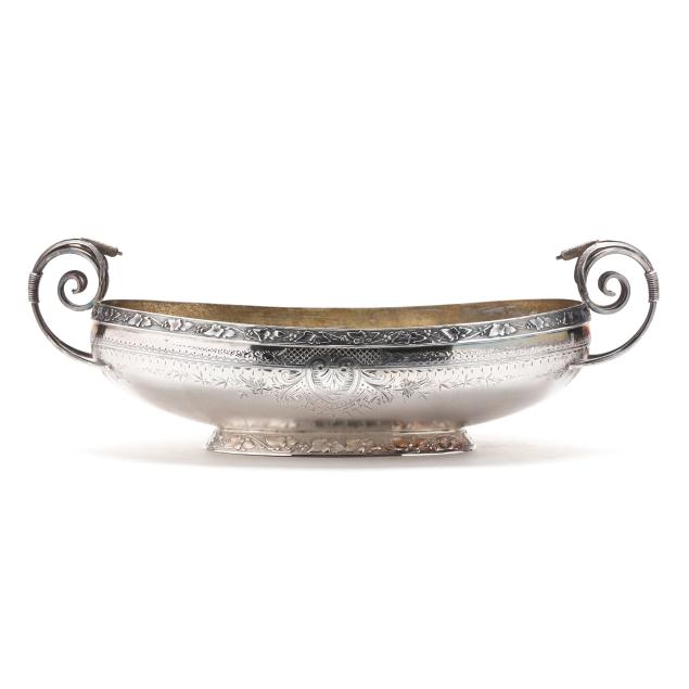 Circa 1870s, featuring scrolled cat-tail handles, a gold wash interiors, relief acanthus decoration to the rim and foot; and period stylized engraving to the well and exterior, not monogrammed.