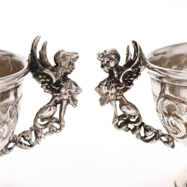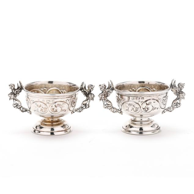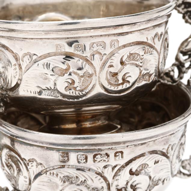 Birmingham (1900), with griffin double handles and repousse scrolling to the bowls, raised on pedestal feet, not monogrammed.