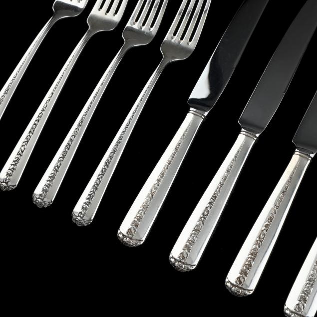 (16) pieces to include: (4) dinner knives (8 3/4 in.); (4) dinner forks (7 3/8 in.); (4) salad forks (6 5/8 in.); and (4) teaspoons (5 7/8 in.); not monogrammed.