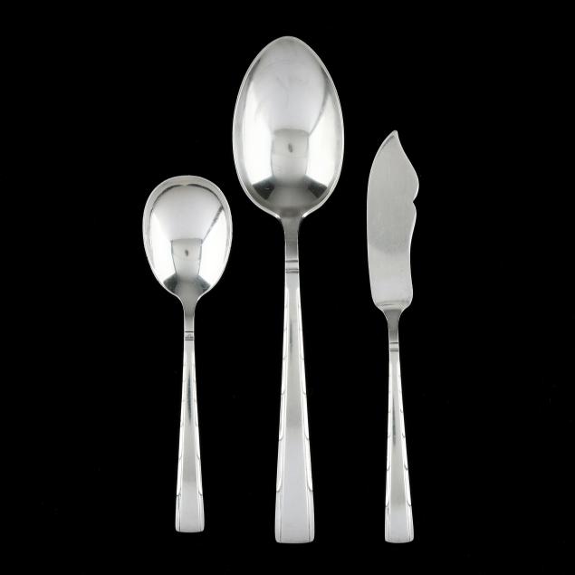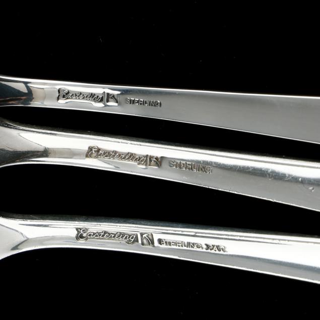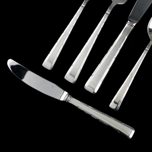 (69) pieces to include: (8) dinner knives (8 7/8 in.); (16) forks (7 1/4 in.); (16) salad forks (6 5/8 in.); (16) teaspoons (6 in.); (8) butter spreaders; (3) tablespoons; a sugar spoon; and a master butter knife; not monogrammed.