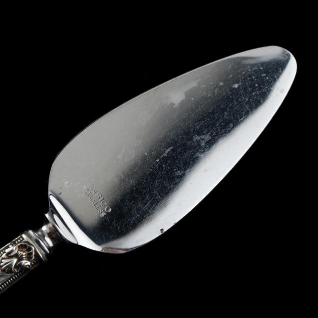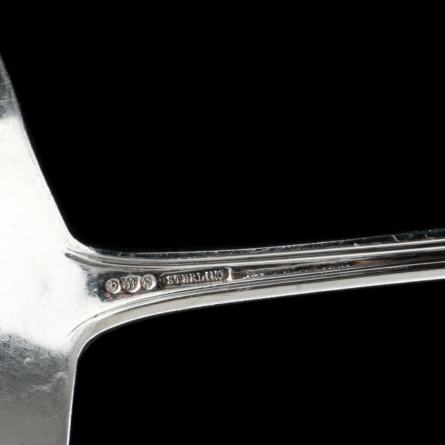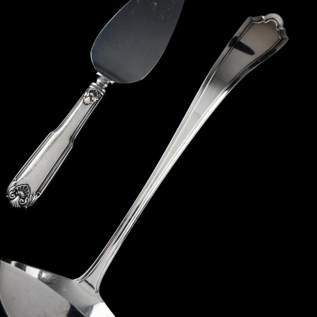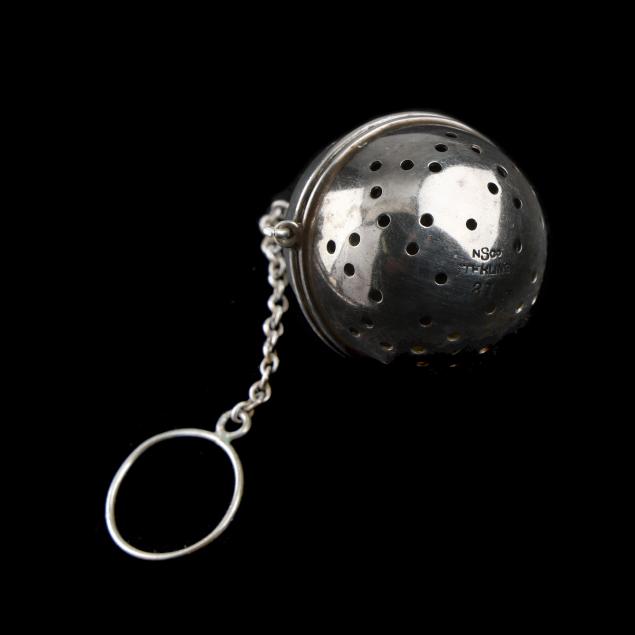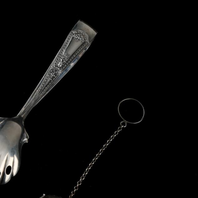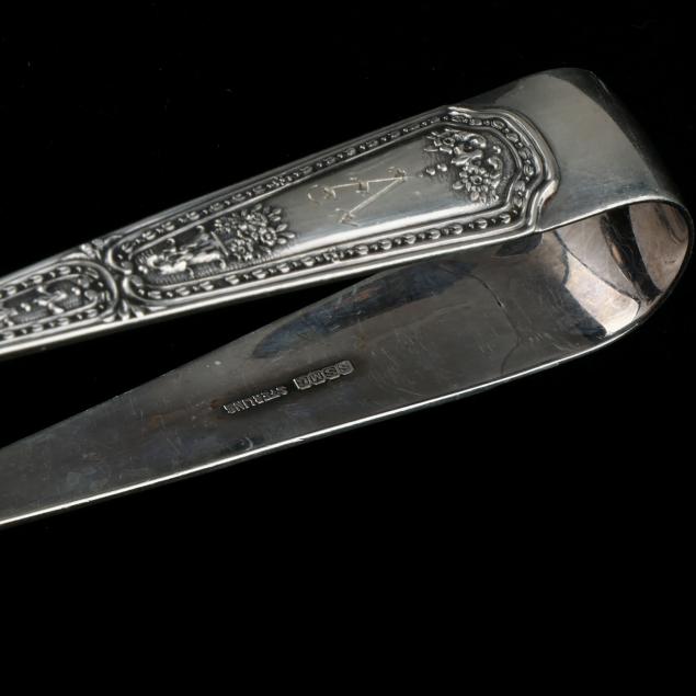 punch ladle (9 1/2 in.); a pair of Sterling Silver Mfg. Co ice tongs; a sterling handled cheese knife; and a Newburyport Sterling silver tea ball; (2) pieces monogrammed.